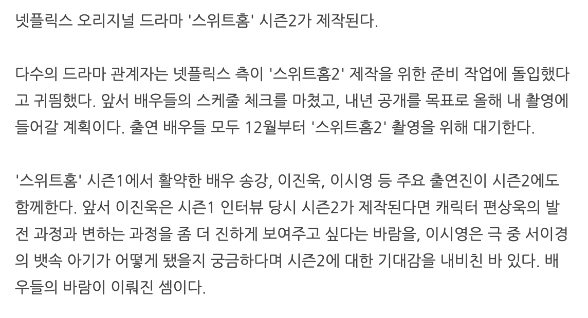 [기사][단독] '스위트홈2' 제작…송강·이시영·이진욱 재회 작성자너무 습해|작성시간21.07.09|조회수1,517 목록 댓글 0 글자크기 작게가 글자크기 크게가 https://entertain.naver.com/read?oid=437&aid=0000270724 [단독] '스위트홈2' 제작…송강·이시영·이진욱 재회넷플릭스 오리지널 드라마 '스위트홈' 시즌2가 제작된다. 다수의 드라마 관계자는 넷플릭스 측이 '스위트홈2' 제작을 위한 준비 작업에 돌입했다고 귀띔했다. 앞서 배우들의 스케줄 체크를 마쳤entertain.naver.com 다음검색 현재 게시글 추가 기능 열기 북마크 공유하기 신고 센터로 신고 댓글 댓글 0 댓글쓰기 답글쓰기 댓글 리스트