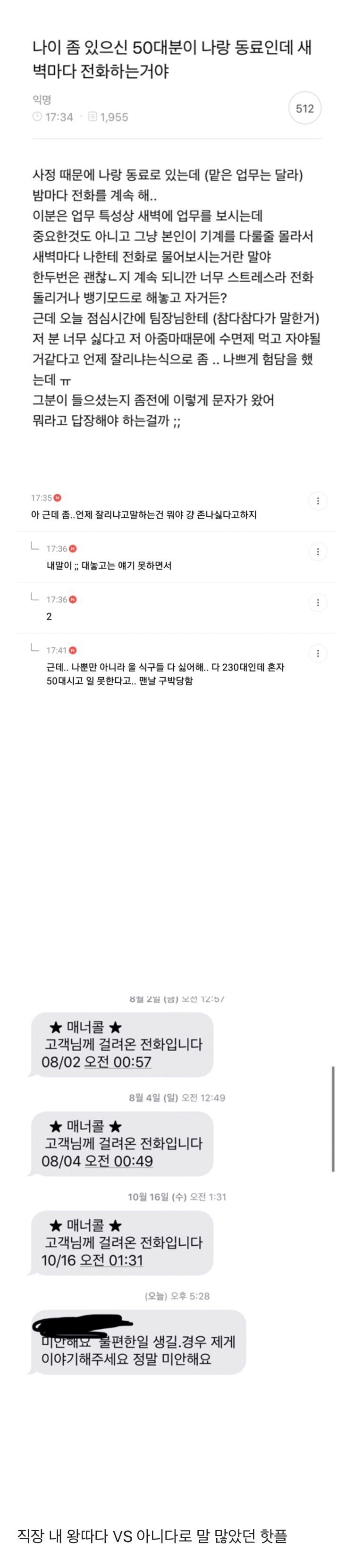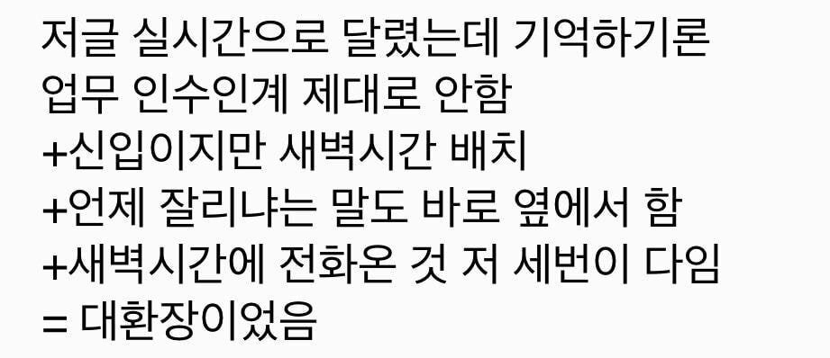 신입한테 사수 안붙이고 새벽시간에 배정한 회사도 문제고 저사람 인성도 문제다. 저사람도 똑같은 일 당했으면