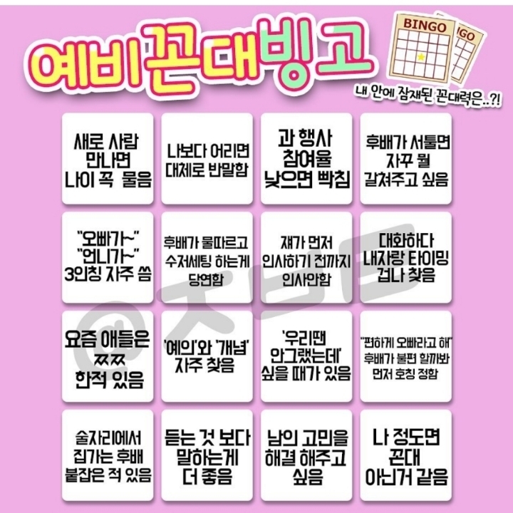 [기타]꼰대 체크해보자 작성자안돼 하지마|작성시간21.08.03|조회수906 목록 댓글 0 글자크기 작게가 글자크기 크게가 다음검색 현재 게시글 추가 기능 열기 북마크 공유하기 신고 센터로 신고 댓글 댓글 0 댓글쓰기 답글쓰기 댓글 리스트