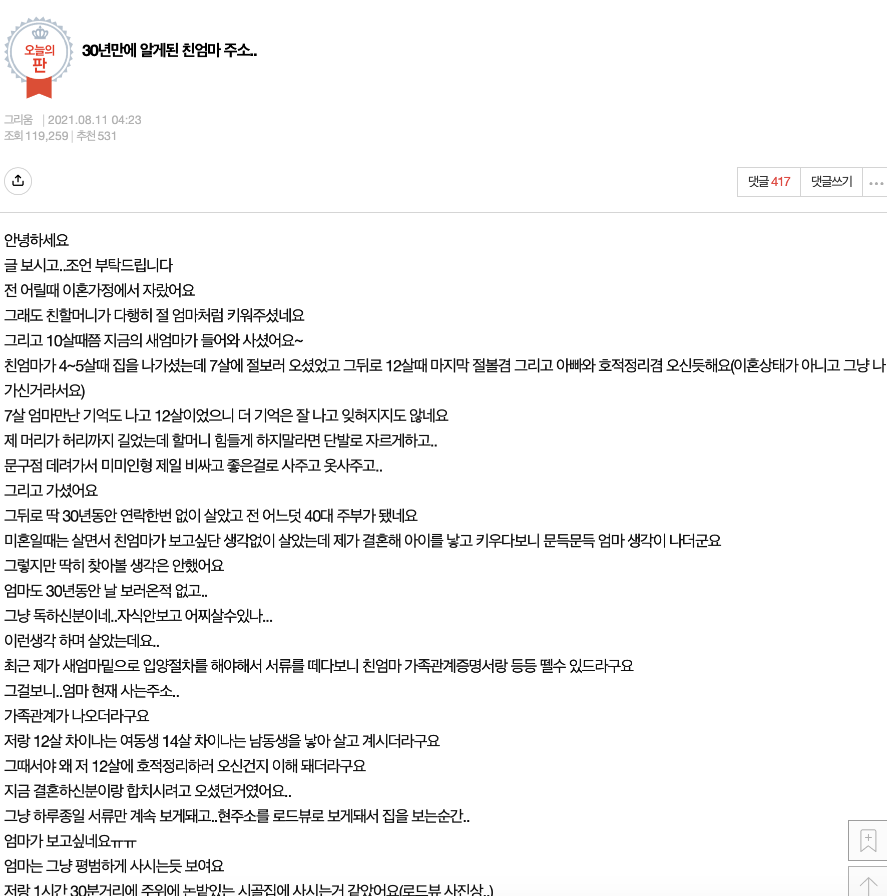그동안 아이키우며 가끔씩 친엄마 생각해보긴 했지만 적극적으로 찾을 생각 없었고 또..