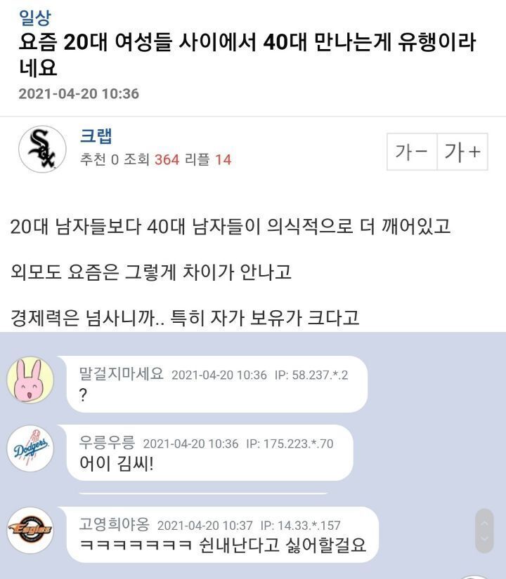 [기타]엠팍남 : 요즘 20대 여성들 사이에서 40대 만나는게 유행이라네요.jpg 작성자수고했어요 갓연경|작성시간21.08.19|조회수1,296 목록 댓글 8 글자크기 작게가 글자크기 크게가 ? 다음검색 현재 게시글 추가 기능 열기 북마크 공유하기 신고 센터로 신고 댓글 댓글 8 댓글쓰기 답글쓰기 댓글 리스트 답댓글 작성자행복해지자구 | 작성시간 21.08.19 개빡치네 ㅅㅂ 작성자비오는날너무싫다는 | 작성시간 21.08.19 그 스엑스는 이십대들의 문화죠 그놈이랑 같은놈아님? 작성자나는지금알탕이먹고싶어 | 작성시간 21.08.19 작성자백천만십만복숭아 | 작성시간 21.08.20 저 20대 여 좋은집안아니지만 제돈으로 자가용두개 보유중^^ 별 쌉소리가다있메 작성자라이언은 춘식이집사 | 작성시간 21.08.20 ? 댓글 전체보기