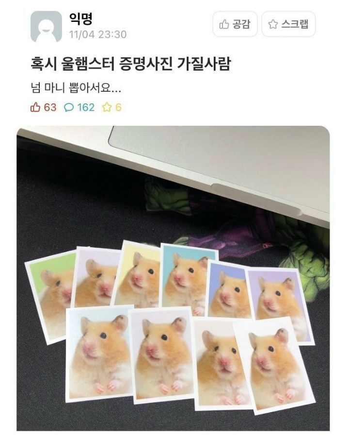 [기타]혹시 울햄스터 증명사진 가질 사람 작성자NAKKA|작성시간21.08.24|조회수1,322 목록 댓글 1 글자크기 작게가 글자크기 크게가 다음검색 현재 게시글 추가 기능 열기 북마크 공유하기 신고 센터로 신고 댓글 댓글 1 댓글쓰기 답글쓰기 댓글 리스트 작성자타이레놀은왜품절이에요 | 작성시간 21.08.24 헠...너무귀엽다 댓글 전체보기