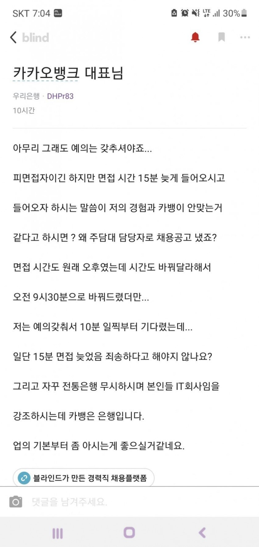 [스크랩] [기타]카카오뱅크 대표 면접 후기..jpg 작성자나븐녀석|작성시간21.11.04|조회수1,889 목록 댓글 1 글자크기 작게가 글자크기 크게가 다음검색 스크랩 원문 : 쭉빵카페 현재 게시글 추가 기능 열기 북마크 공유하기 신고 센터로 신고 댓글 댓글 1 댓글쓰기 답글쓰기 댓글 리스트 작성자벌써부터캐롤메들리듣는사람 | 작성시간 21.11.04 카카오...역시..... 댓글 전체보기