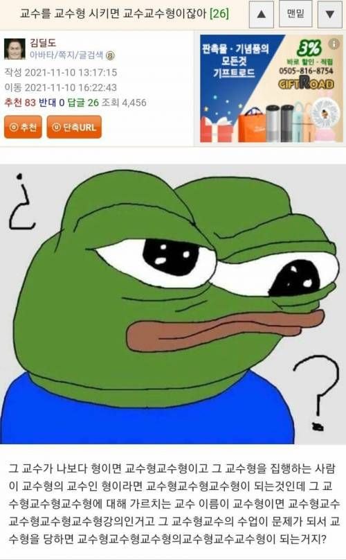 [기타]교수를 교수형 시키면 교수교수형 이잖아. 작성자평범하지만|작성시간21.11.13|조회수915 목록 댓글 0 글자크기 작게가 글자크기 크게가 다음검색 현재 게시글 추가 기능 열기 북마크 공유하기 신고 센터로 신고 댓글 댓글 0 댓글쓰기 답글쓰기 댓글 리스트