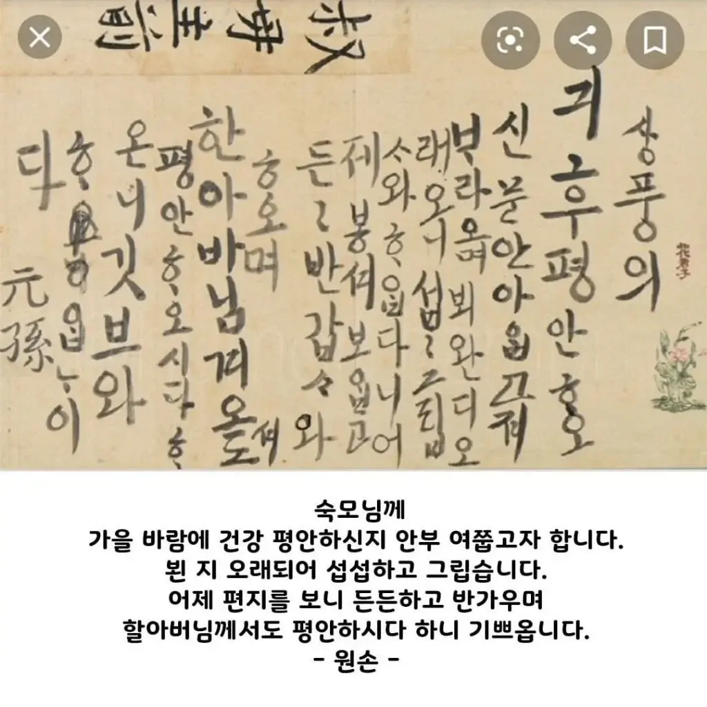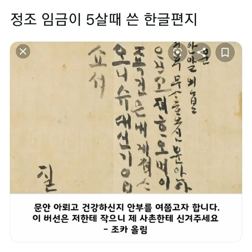 [스크랩] [기타]정조가 5살때 쓴 한글편지 작성자스태커2|작성시간21.12.04|조회수550 목록 댓글 0 글자크기 작게가 글자크기 크게가 다음검색 스크랩 원문 : 쭉빵카페 현재 게시글 추가 기능 열기 북마크 공유하기 신고 센터로 신고 댓글 댓글 0 댓글쓰기 답글쓰기 댓글 리스트