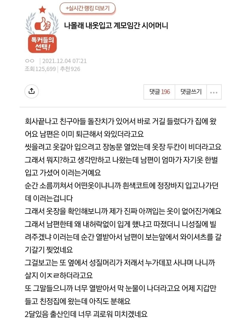 [판&톡]나 몰래 내 옷 입고 계모임 간 시어머니 작성자지위픽|작성시간21.12.10|조회수1,850 목록 댓글 0 글자크기 작게가 글자크기 크게가 다음검색 현재 게시글 추가 기능 열기 북마크 공유하기 신고 센터로 신고 댓글 댓글 0 댓글쓰기 답글쓰기 댓글 리스트