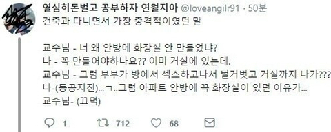 [기타]아파트 안방에 화장실이 있는 이유.jpg 작성자놀라워|작성시간21.12.13|조회수1,320 목록 댓글 1 글자크기 작게가 글자크기 크게가 다음검색 현재 게시글 추가 기능 열기 북마크 공유하기 신고 센터로 신고 댓글 댓글 1 댓글쓰기 답글쓰기 댓글 리스트 작성자Lorona | 작성시간 21.12.14 ㅋㅋㅋㅋㅋㅎㄹ 댓글 전체보기
