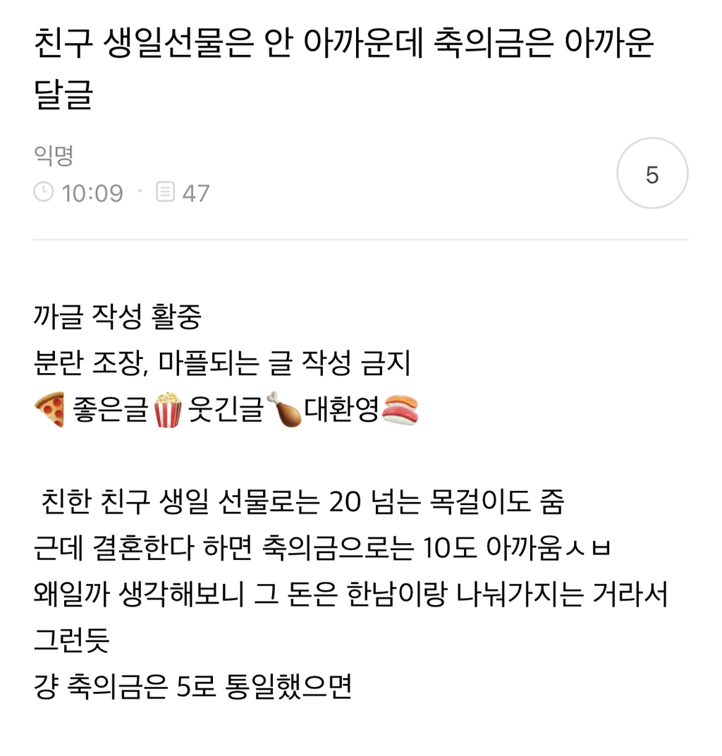[기타]친구 생일 선물은 안 아까운데 축의금은 아까운 달글 작성자ㅁ ㅏ ㄹ ㅏ ㅁ ㅏㅅ|작성시간22.04.22|조회수627 목록 댓글 0 글자크기 작게가 글자크기 크게가 결혼이 왜 축하할 일인지도 모르겠고 친구 뺏긴다고 생각하는데 거기다 돈까지 내야하니 더 싫은듯 다음검색 현재 게시글 추가 기능 열기 북마크 공유하기 신고 센터로 신고 댓글 댓글 0 댓글쓰기 답글쓰기 댓글 리스트