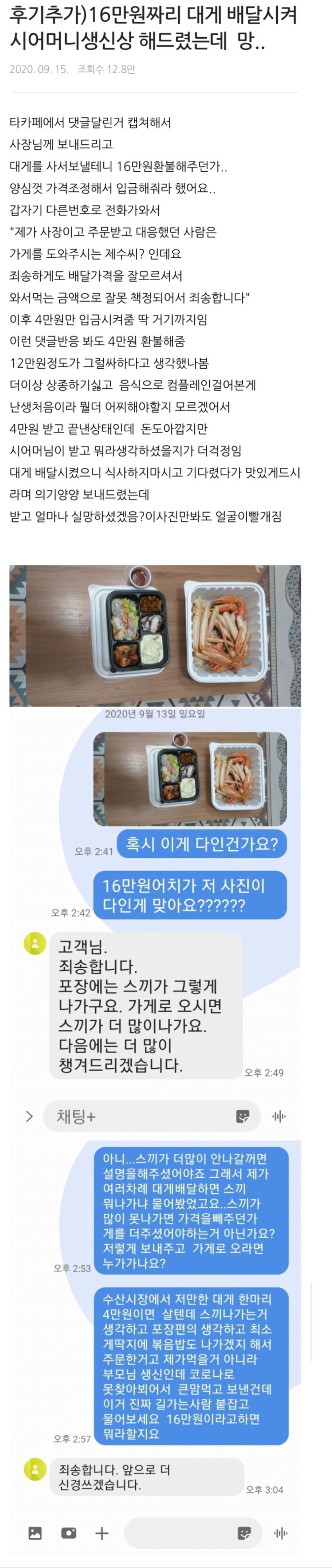 [기타]부모님 생일에 주문한 대게 16만원 후기 작성자와인리셀러|작성시간22.05.04|조회수118,455 목록 댓글 1 글자크기 작게가 글자크기 크게가 대게 16만원 배달시켰다가 주문자가 저거보고 기겁함 인터넷에서 떠들썩하자 뒤늦게 상황을 파악한 가게주인 4만원 환불해줌 4만원에 해준게아니고 4만원환불 작년이맘때고 매장명 공개안됨 다음검색 현재 게시글 추가 기능 열기 북마크 공유하기 신고 센터로 신고 댓글 댓글 1 댓글쓰기 답글쓰기 댓글 리스트 작성자빈 깡 통 불 알 | 작성시간 22.05.20 미쳐버렸네.. 댓글 전체보기