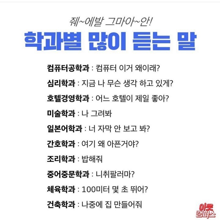 [스크랩] [기타]학과별 많이듣는말 작성자부먹찍먹|작성시간22.05.29|조회수277 목록 댓글 0 글자크기 작게가 글자크기 크게가 다음검색 스크랩 원문 : 쭉빵카페 현재 게시글 추가 기능 열기 북마크 공유하기 신고 센터로 신고 댓글 댓글 0 댓글쓰기 답글쓰기 댓글 리스트