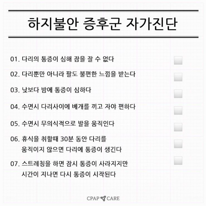 하지불안증후군은 주로 다리, 그리고 꽤 자주 팔에 말로 표현하기 힘든 기괴한 불편감이 나타나는 것이 특징인 질환이다. 환자에 따라서 증상에 대한 표현은 다양하지만 다리나 팔 깊은 곳에서 뭔가 불편한 느낌이 들고, 증상을 정확히 표현하기 힘든다고 한다.