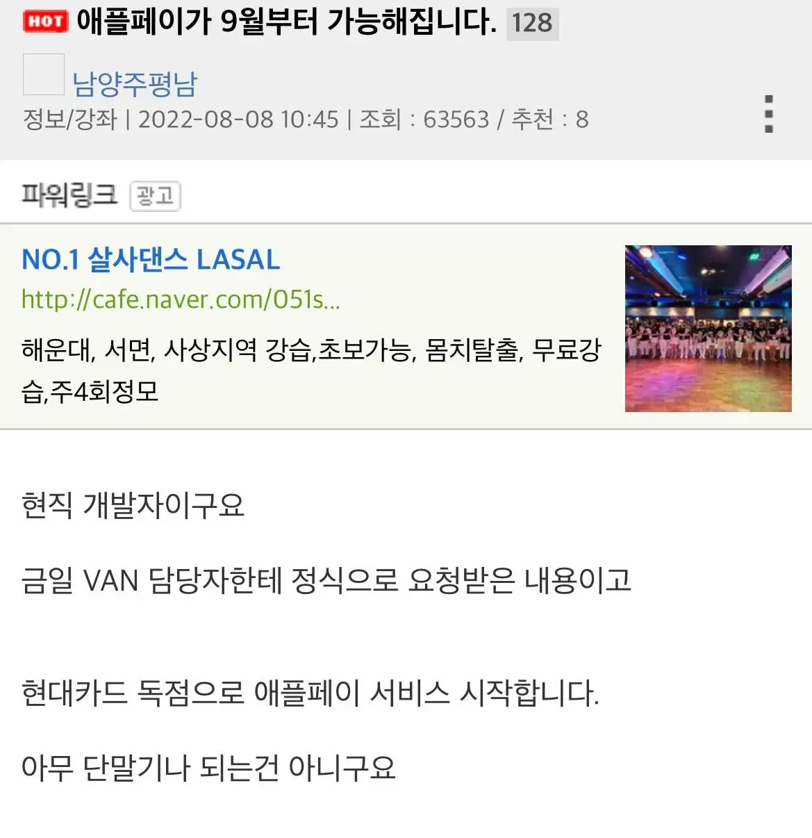 [기타]9월부터 애플페이가 가능해집니다 작성자댓글 하나 부탁드려요|작성시간22.08.08|조회수1,074 목록 댓글 0 글자크기 작게가 글자크기 크게가 다음검색 현재 게시글 추가 기능 열기 북마크 공유하기 신고 센터로 신고 댓글 댓글 0 댓글쓰기 답글쓰기 댓글 리스트