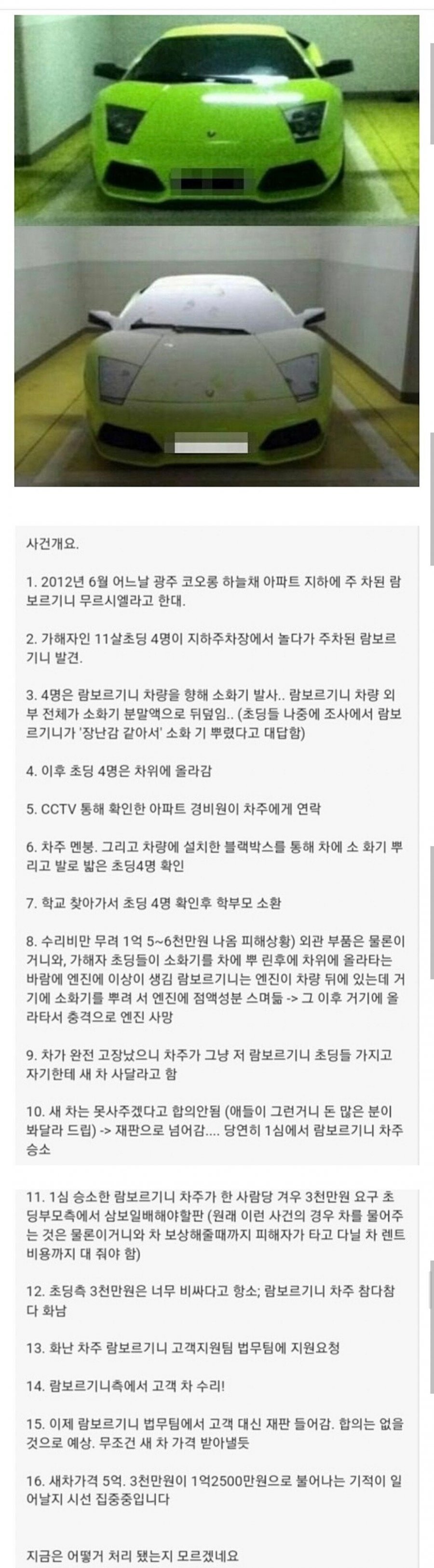 초등학생 4명중 한명이 아버지가 광주지법 판사로 활동중이였으며. 람보르기니 차주의 경우. 사업가로써, 경찰이 뒤를 캐면 상당히 불리한 점이 많았던 입장에 있었던걸로 알려져있습니다. 그래서 초등생 부모의 법적인 압력이 있었으며. 수리비는 6000만원에 합의봤다고 합니다. 개인당 1500씩 말이죠.