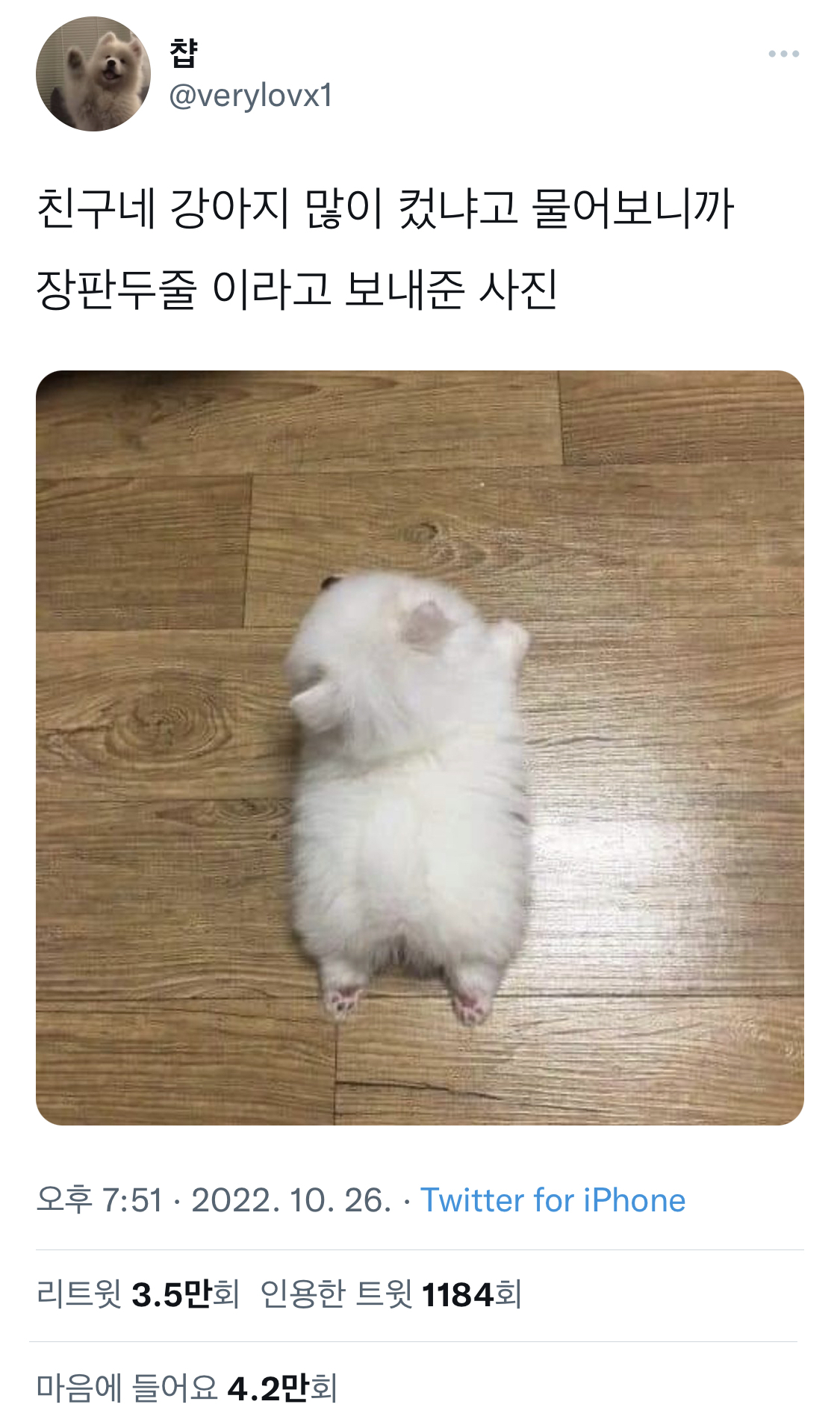 CAFE [기타] 친구네 강아지 많이 컸냐고 물어보니까 장판 두줄 이라고 보내준 사진 쭉빵카페 작성시간22.12.06 앱으로보기 카페방문 현재 게시글 추가 기능 열기 공유하기 신고 센터로 신고