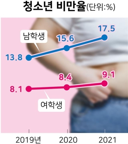 여학생 비만율은 2019년 8.1%, 2020년 8.4%, 지난해 9.1%로 완만하게 높아졌다. 같은 기간 남학생은 13.8%에서 15.6%, 17.5%로 뛰었다.