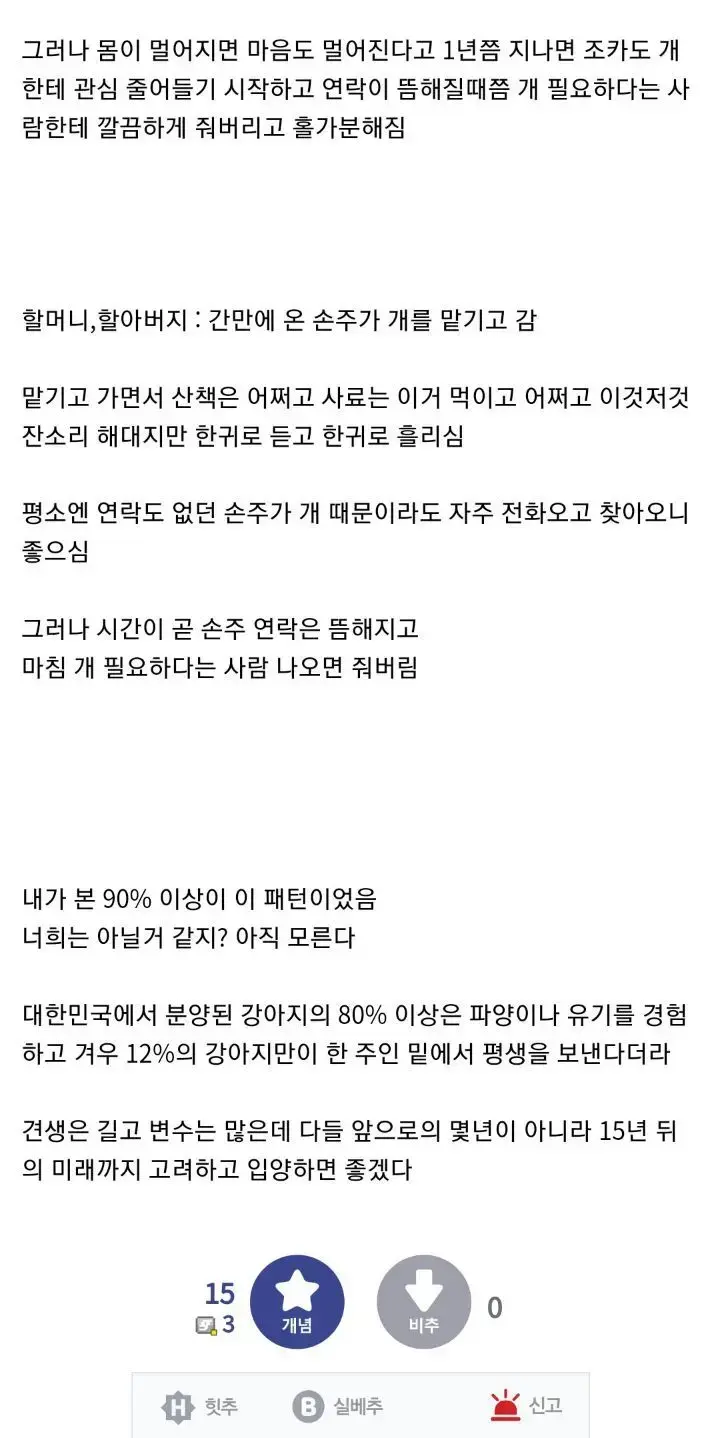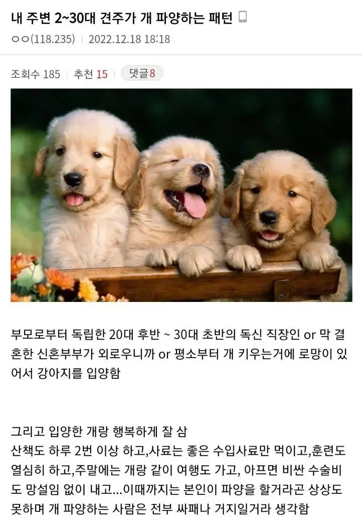 [기타]2030 견주가 개 파양하는 패턴 작성자결 국|작성시간22.12.20|조회수622 목록 댓글 0 글자크기 작게가 글자크기 크게가 다음검색 현재 게시글 추가 기능 열기 북마크 공유하기 신고 센터로 신고 댓글 댓글 0 댓글쓰기 답글쓰기 댓글 리스트