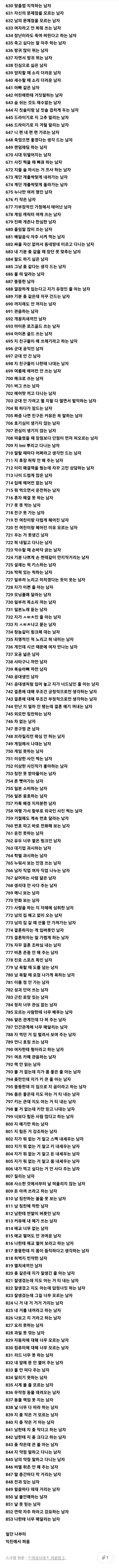 630 맞춤법 지적하는 남자 631 자신의 문제점을 모르는 남자 632 남의 문제점을 모르는 남자 633 여자라고 안 봐줘 쓰는 남자 634 장난이라도 죽여 버린다고 하는 남자 635 죽고 싶다는 말 자주 하는 남자 636 방귀 많이 뀌는 남자 637 자면서 방귀 뀌는 남자 638 진심으로 싫은 남자 639 양치할 때 소리 더러운 남자 640 세수할 때 소리 더러운 남자 641 아빠 같은 남자 642 어린애한테 거짓말하는 남자 643 숨 쉬는 것도 재수없는 남자 644 지 칫솔이랑 남 칫솔 겹치게 두는 남자 645 드라이기로 지 고추 말리는 남자 646 드라이기로 지 겨털 말리는 남자 647 니 편 내 편 편 가르는 남자 648 죽었으면 좋겠다는 생각 드는 남자 649 랜덤채팅 하는 남자 670 시대 뒤떨어지는 남자 671 사진 찍을 때 뻐큐 하는 남자 672 지들 술 마시는 거 프사 하는 남자 673 계단 개촐싹맞게 내려가는 남자 674 계단 개촐싹맞게 올라가는 남자 675 누나만 여러 명인 남자 676 키 작은 남자 677 가부장적인 가정에서 태어난 남자 678 게임 캐릭터 여캐 쓰는 남자 679 진짜 개존나 한심한 남자 680 줄임말 많이 쓰는 남자 681 배달음식 자주 시켜 먹는 남자 682 싸울 자신 없어서 동네방네 이르고 다니는 남자 683 내 기분 좆 같을 때 장단 못 맞추는 남자 684 말도 하기 싫은 남자 685 그냥 좆 같다는 생각 드는 남자 686 물 떠 달라는 남자 687 뚱뚱한 남자 688 깔끔하게 입는다고 지가 유정인 줄 아는 남자 689 기분 좆 같은데 자꾸 건드는 남자 690 꺼지래도 안 꺼지는 남자 691 관음하는 남자 692 개꽁치새끼인 남자 693 아이폰 로즈골드 쓰는 남자 694 아이폰 골드 쓰는 남자 695 지 친구들이 얘 쓰레기라고 하는 남자 696 군대 공익인 남자 697 군대 안 간 남자 698 지 친구들이 나한테 나대는 남자 699 여름에 에어컨 안 쓰는 남자 700 매크로 쓰는 남자 701 버그 쓰는 남자 702 에어팟 끼고 다니는 남자 703 군대 안 가려고 별 지랄 다 떨면서 발악하는 남자 704 뭐 하다가 잠드는 남자 705 짜증 나면 친구든 커뮤든 꼭 말하는 남자 706 호기심이 생기지 않는 남자 707 관심이 생기지 않는 남자 708 떠올렸을 때 장점보다 단점이 먼저 떠오르는 남자 709 지 tmi 뿌리고 다니는 남자 710 말할 때마다 어쩌라고 생각만 드는 남자 711 지 후장 허락 안 해 주는 남자 712 이미 해결책을 줬는데 자꾸 고민 상담하는 남자 713 나이 드럽게 많은 남자 714 집에 에어컨 없는 남자 715 뭐 먹으면서 운전하는 남자 716 혼자 해결 못 하는 남자 717 못 못 박는 남자 718 전구 못 가는 남자 719 전 여친이랑 더럽게 헤어진 남자 720 전 여친이랑 헤어진 이유 모르는 남자 721 우는 거 못생긴 남자 722 혀 내밀고 다니는 남자 723 악수할 때 손바닥 긁는 남자 724 기분 나쁘게 손 변태같이 만지작거리는 남자 725 설레는 척 키스하는 남자 726 박력 있는 척하는 남자 727 일부러 노리고 미치겠다는 듯이 웃는 남자 728 지가 이쁜 줄 아는 남자 729 모닝콜해 달라는 남자 730 일부러 목소리 까는 남자 731 일본노래 듣는 남자 732 지가 ᄉᄐᄎ인 줄 아는 남자 733 지 ᄉᄐᄎ냐고 묻는 남자 734 창놈같이 윙크해 대는 남자 735 치명적인 척 노리고 혀 내미는 남자 736 게인데 시선 때문에 여자 만나는 남자 737 모공 넓은 남자 738 사타구니 까만 남자 739 복숭아뼈 까만 남자 740 공대생인 남자 741 공대생처럼 입어 놓고 지가 너드남인 줄 아는 남자 742 결혼에 대해 무조건 긍정적으로만 생각하는 남자 743 결혼에 대해 무조건 부정적으로만 생각하는 남자 744 만난 지 얼마 안 됐는데 결혼 얘기 꺼내는 남자 745 외모만 칭찬하는 남자 746 차 없는 남자 747 콧구멍 큰 남자 748 브라질리언 왁싱 안 하는 남자 749 게임에서 나대는 남자 750 게임 못하는 남자 751 이상한 사진 찍는 남자 752 이상한 사진작가 좋아하는 남자 753 칭찬 못 받아들이는 남자 754 폰 뺏어가는 남자 755 일본 소비하는 남자 756 일본 옹호하는 남자 757 카톡 배경 지저분한 남자 758 여행 가서 함부로 외국인 사진 찍는 남자 759 거절해도 계속 번호 달라는 남자 760 번호 따고 바로 전화해 보는 남자 761 운전 못하는 남자 762 유두 너무 옅은 핑크인 남자 763 대기업 과시하는 남자 764 학벌 과시하는 남자 765 누워서 보는 안경 쓰는 남자 766 남자 직업 여자 직업 나누는 남자 767 싫어하는 사람 닮은 남자 768 생리대 안 사다 주는 남자 769 애니 보는 남자 770 만화 보는 남자 771 사랑을 하는 지 자체에 심취한 남자 772 남의 집 예고 없이 오는 남자 773 남의 집 갈 때 선물 안 가져가는 남자 774 결혼하자는 게 입버릇인 남자 775 결혼하자는 말 가볍게 하는 남자 776 자꾸 결혼 조바심 내는 남자 777 비혼 존중 안 해 주는 남자 778 진로 스포츠 쪽인 남자 779 남 욕할 때 도를 넘는 남자 780 남 욕할 때 요점 나가게 욕하는 남자 781 이름 정 안 가는 남자 782 성괴 단어 쓰는 남자 783 근친 로망 있는 남자 784 정치 너무 관심 없는 남자 785 모르는 사람한테 너무 베푸는 남자 786 얕은 관계인데 다 퍼 주는 남자 787 인간관계에 너무 매달리는 남자 788 지 먹던 거 입 벌려서 보여 주는 남자 789 언니 호칭 쓰는 남자 790 여자한테 형이라고 하는 남자 791 여초 카페 관음하는 남자 792 책 안 읽는 남자 793 볼 거 없는데 지가 몸 좋은 줄 아는 남자 794 좆만인데 지가 키 큰 줄 