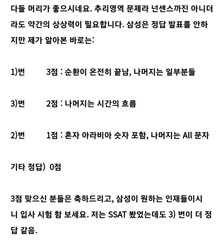 [기타]삼성 ssat 기출문제 작성시간23.02.20|조회수347 목록 댓글 0 글자크기 작게가 글자크기 크게가 정답은 아래에..... 다음검색 현재 게시글 추가 기능 열기 북마크 공유하기 신고 센터로 신고 댓글 댓글 0 댓글쓰기 답글쓰기 댓글 리스트