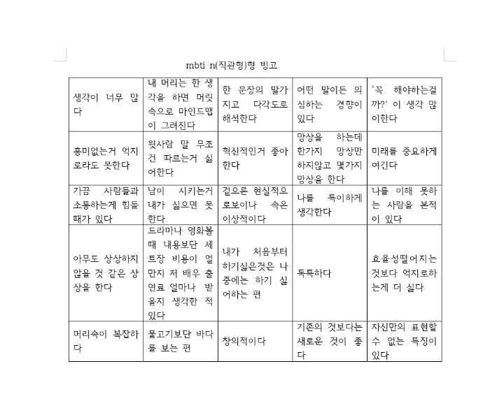 [스크랩] [기타]mbti n(직관형)형 빙고 작성자⠀ ⠀ ⠀ ⠀⠀|작성시간23.05.28|조회수452 목록 댓글 0 글자크기 작게가 글자크기 크게가 감각형과 비율이 비슷한 직관형 분들은 공감 많이 안될거에요.출처- 나 다음검색 스크랩 원문 : 쭉빵카페 현재 게시글 추가 기능 열기 북마크 공유하기 신고 센터로 신고 댓글 댓글 0 댓글쓰기 답글쓰기 댓글 리스트