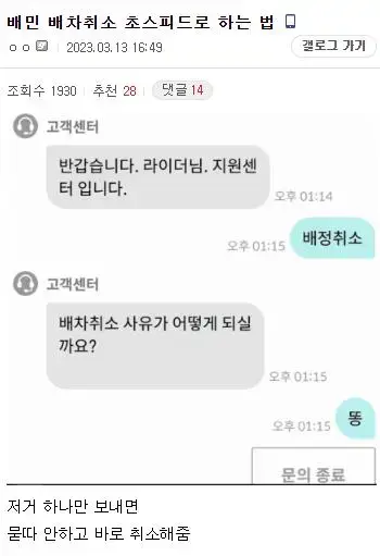 [기타]배민 배달부의 배차 취소 방법.jpg 작성자Golden|작성시간23.06.21|조회수1,011 목록 댓글 0 글자크기 작게가 글자크기 크게가 다음검색 현재 게시글 추가 기능 열기 북마크 공유하기 신고 센터로 신고 댓글 댓글 0 댓글쓰기 답글쓰기 댓글 리스트