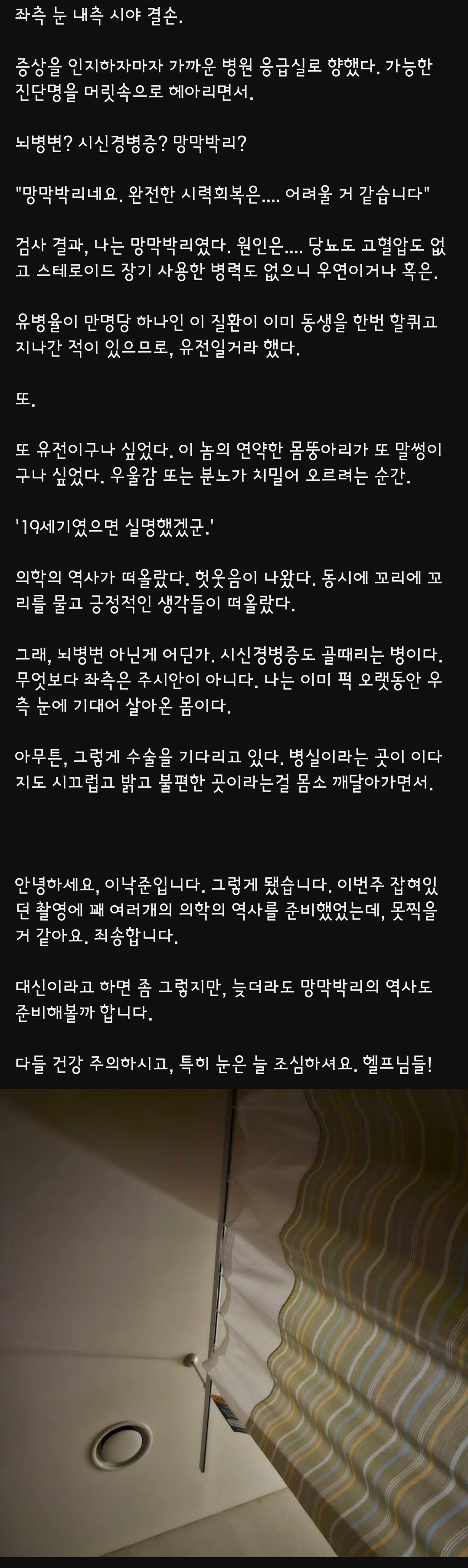 [기타]이낙준(작가 한산이가) 망막박리로 수술 한다고 함 작성자옥 수 수 수 염|작성시간23.09.03|조회수1,530 목록 댓글 1 글자크기 작게가 글자크기 크게가 중증외상센터 : 골든 아워등을 쓴 웹소설 작가이자 이비인후과 의사이자 닥터프렌즈 유튜버 망막박리로 수술한다고 ㅠ ㅠ 다들 눈건강 조심 다음검색 현재 게시글 추가 기능 열기 북마크 공유하기 신고 센터로 신고 댓글 댓글 1 댓글쓰기 답글쓰기 댓글 리스트 작성자최재림 | 작성시간 23.09.04 망막박리 진짜 증상도 없이 갑자기 느끼는 병이라 무서움 다들 건강검진할때 눈도 정밀검진 받기 댓글 전체보기