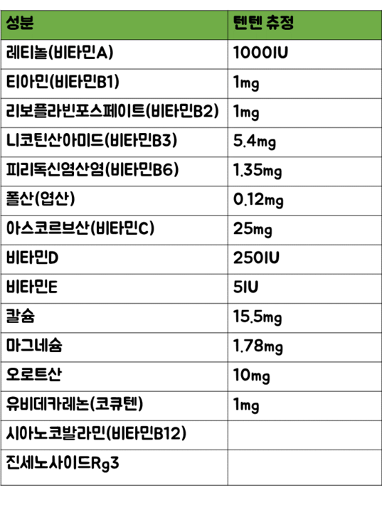 위는 텐텐 1알에 포함된 성분을 나타낸 표인데