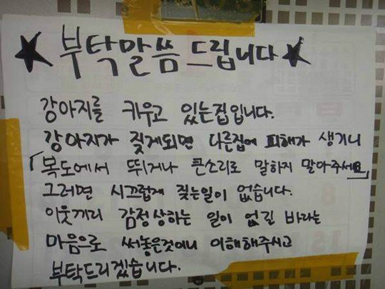 작성자또까꿍 작성시간 15.12.04 당연히 복도에서 조용해야하는건 맞는거라 생각하는데 진짜 어떤집은 개짖는소리땜에 소음으로 싫어하는 집있으니깐 그냥 원래당연한 예절만 지켜도 개도 크게 짖는일이 안생긴다는거아닌가..이웃 생각해서 써놓은말같구 마지막에 이해하고 부탁드린다고 정중하게 쓴거같은데..