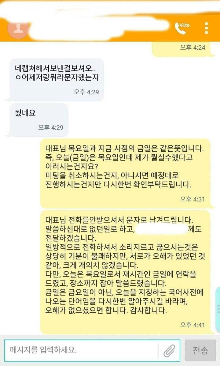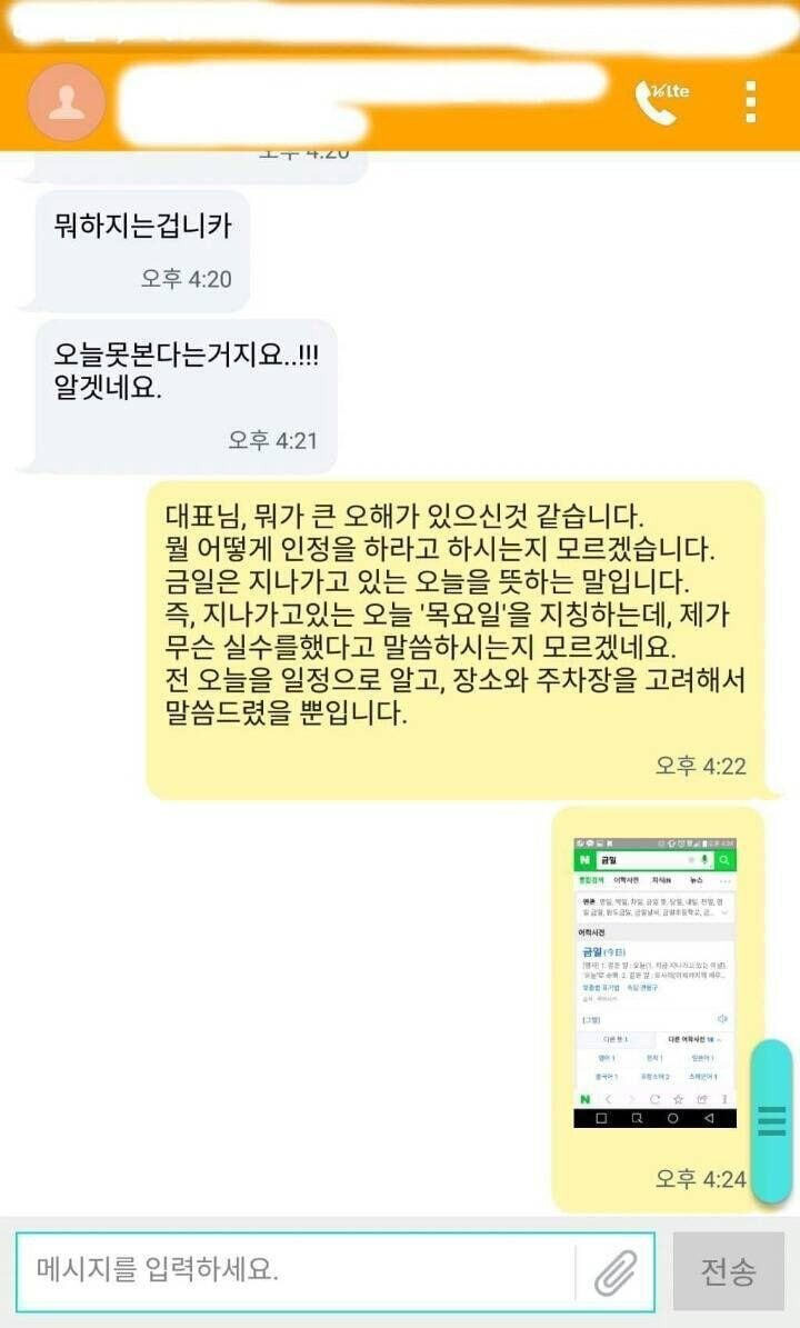 [기타]‘금일’이란 단어를 모르는 거래처 사장 작성자JB|작성시간24.08.01|조회수357 목록 댓글 1 글자크기 작게가 글자크기 크게가 다음검색 현재 게시글 추가 기능 열기 북마크 공유하기 신고 센터로 신고 댓글 댓글 1 댓글쓰기 답글쓰기 댓글 리스트 작성자JB | 작성시간 24.08.01 아 무식해 댓글 전체보기