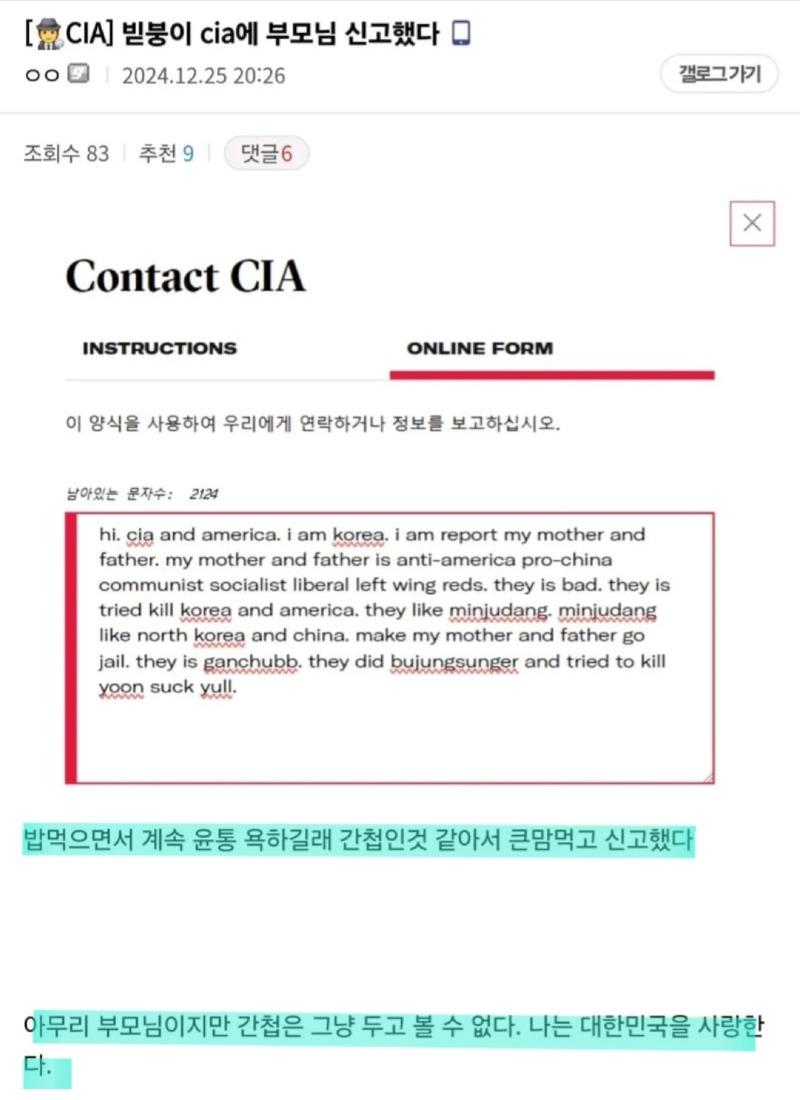 [기타]CIA에 부모님을 신고했다는 디시 유저 작성자JB|작성시간24.12.29|조회수546 목록 댓글 1 글자크기 작게가 글자크기 크게가 다음검색 현재 게시글 추가 기능 열기 북마크 공유하기 신고 센터로 신고 댓글 댓글 1 댓글쓰기 답글쓰기 댓글 리스트 작성자JB | 작성시간 24.12.29 ..;; 댓글 전체보기