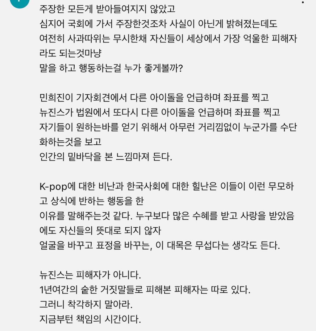 [기타]뉴진스 BBC 인터뷰 영상의 한 댓글. 작성자JB|작성시간25.03.26|조회수1,518 목록 댓글 4 글자크기 작게가 글자크기 크게가 다음검색 현재 게시글 추가 기능 열기 북마크 공유하기 신고 센터로 신고 댓글 댓글 4 댓글쓰기 답글쓰기 댓글 리스트 작성자JB | 작성시간 25.03.26 거룩한척 하네 또 작성자JB | 작성시간 25.03.26 좌표는 하이브 지들이 무료용병 쓰려고 찍어놓고 작성자JB | 작성시간 25.03.26 하붕이냄새나 작성자JB | 작성시간 25.03.27 뭐가 사실이아니라고 드러나? 증거제출했다는 씨씨티비가 그‘알수없는 이유로 해당부분만 삭제됐다’는 그거? 댓글 전체보기