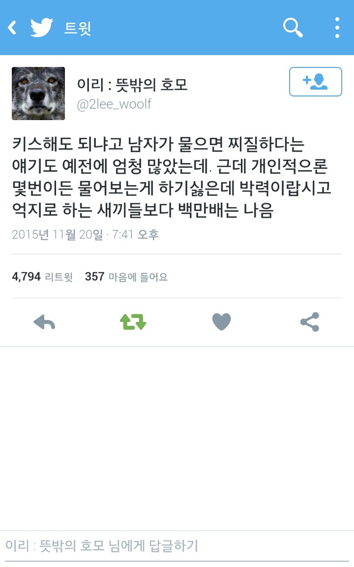 작성자에쿠스말고에스쿱스요 작성시간 15.12.14 왜난물어보는거 존나좋은데 분위기 졸라 좋은상태에서 연하남이 목소리 딱깔고 눈좀풀려서 걍 솔직하게 물어보는거 존나좋다시발