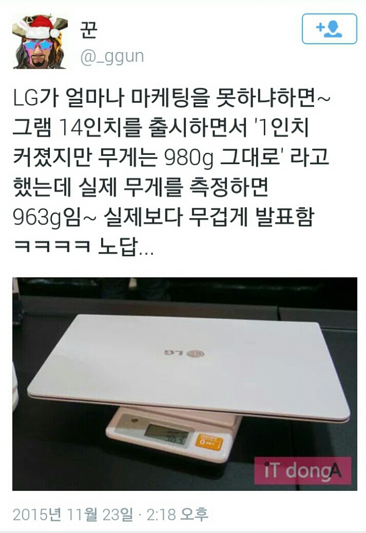 [스크랩] [기타]LG 마케팅팀의 위엄...jpg (feat. LG그램) 작성자정수정(kristal)|작성시간15.12.13|조회수9,472 목록 댓글 30 글자크기 작게가 글자크기 크게가 LG전자에서 LG 그램 14인치를 출시했는데 980g이라고 홍보.그런데...무려 실제보다 가볍다는 후기들이 쏟아짐심지어 전문 리뷰어 사이트에서 측정한 결과 홍보자료보다 가벼움?? 다음검색 스크랩 원문 : 도탁스 (DOTAX) 현재 게시글 추가 기능 열기 북마크 공유하기 신고 센터로 신고 댓글 댓글 30 댓글쓰기 답글쓰기 댓글 리스트 작성자TWICE 지효 | 작성시간 15.12.14 엘지야 제발.. 작성자죤대 배탈나서 이젠 이불 꼭 덮어요. | 작성시간 15.12.14 위에 허니버터칩한테 좀 배우고 와라 작성자다송치킨 | 작성시간 15.12.14 나엘지그램 잘쓰고잇음 메이플도하고테런도함 삭제된 댓글입니다. 답댓글 작성자둠디비다 | 작성시간 15.12.14 랩탑은 발열문제는 어쩔수 없는거 같더라고... 그래서 난 걍 발열 제쳐두고 비용대비 사양제일 좋은거 사고 외부쿨러를 좋은걸 따로삼. 쿨러만 좋아도 발열 거의없어 댓글 전체보기