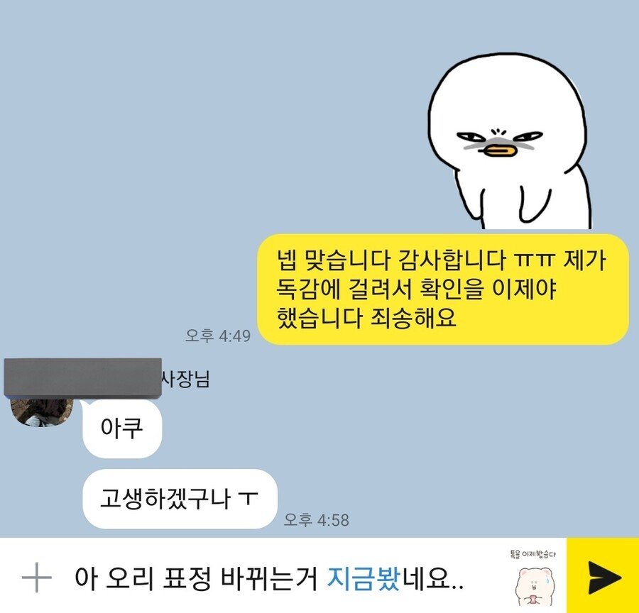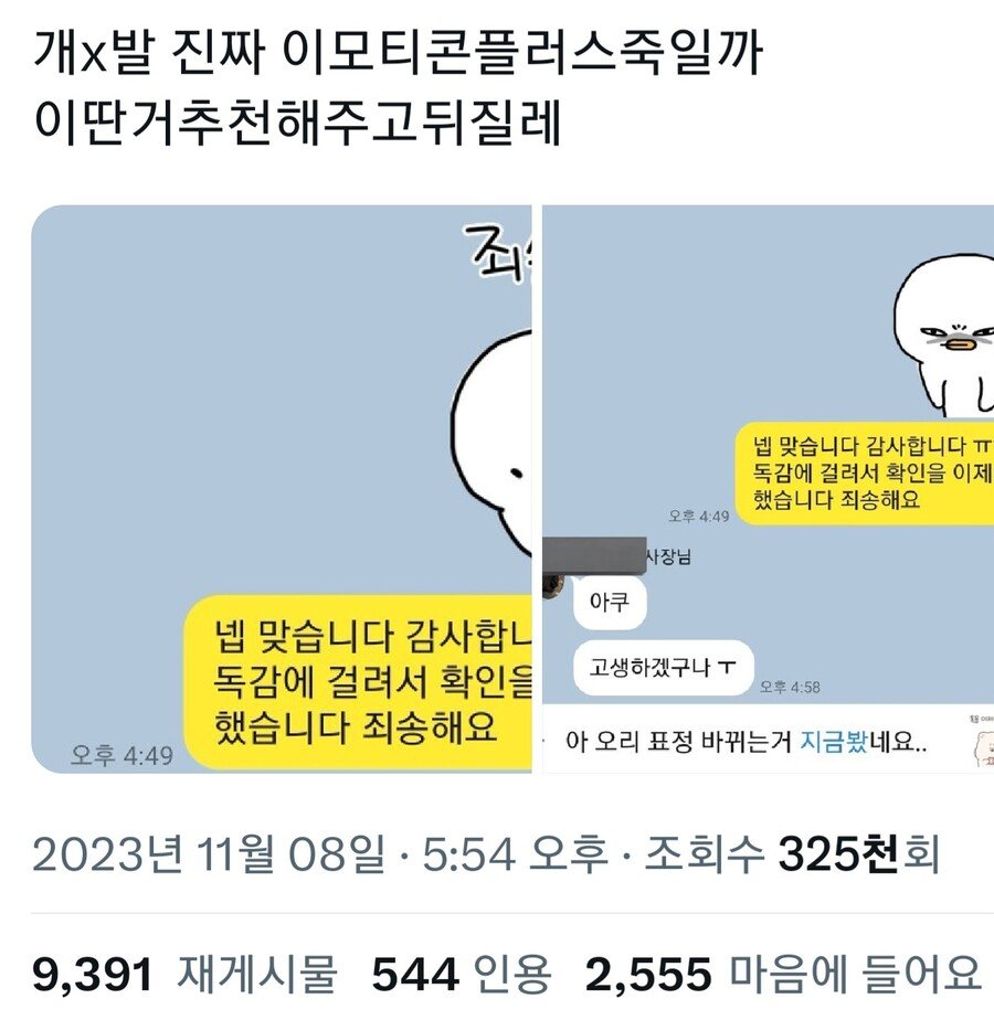 [기타]이모티콘 사고 확인 잘 해야 하는 이유 작성자JB|작성시간25.10.11|조회수851 목록 댓글 1 글자크기 작게가 글자크기 크게가 이 사건을 본 이모티콘 작가가 사과함 다음검색 현재 게시글 추가 기능 열기 북마크 공유하기 신고 센터로 신고 댓글 댓글 1 댓글쓰기 답글쓰기 댓글 리스트 작성자JB | 작성시간 25.10.11 아 ㅋㅋㅋㅋㅋㅋㅅㅂ 댓글 전체보기