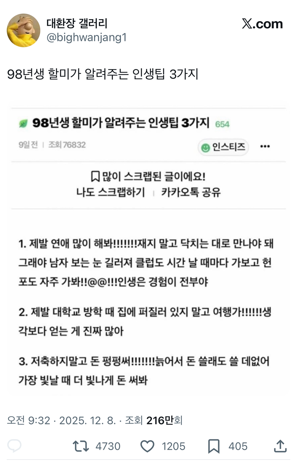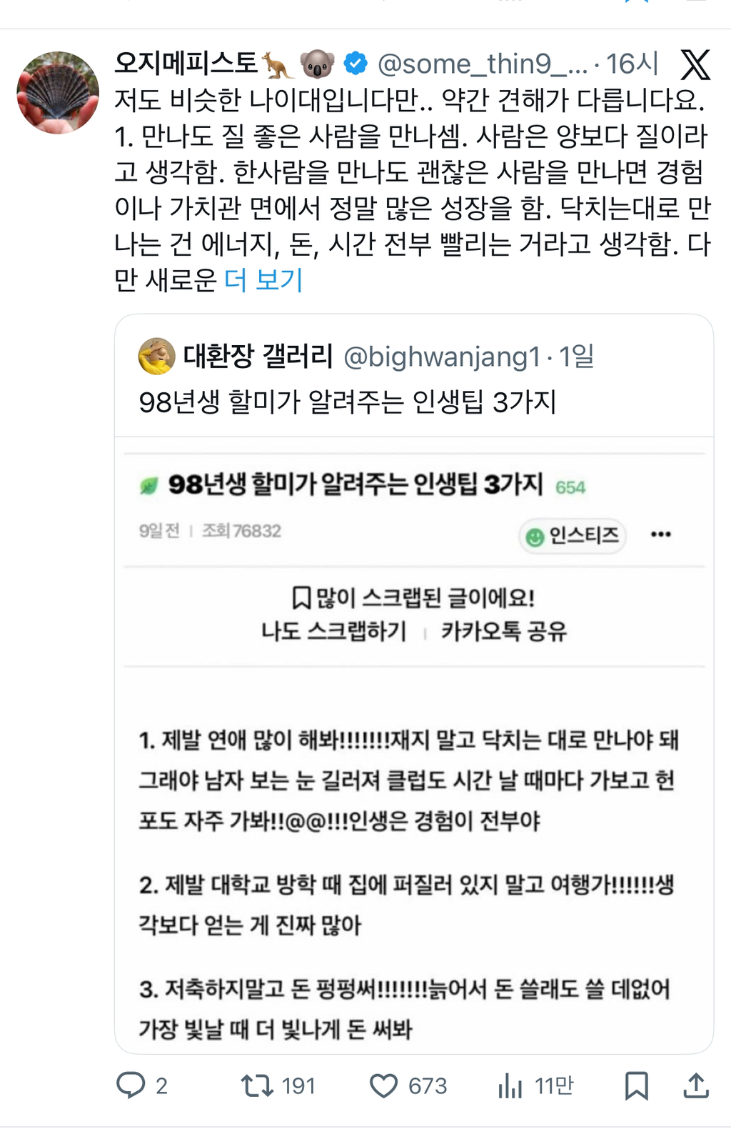 [기타]98년생 할미가 알려주는 인생팁 3가지 작성자JB|작성시간25.12.09|조회수3,258 목록 댓글 7 글자크기 작게가 글자크기 크게가 다음검색 현재 게시글 추가 기능 열기 북마크 공유하기 신고 센터로 신고 댓글 댓글 7 댓글쓰기 답글쓰기 댓글 리스트 작성자JB | 작성시간 25.12.09 98이 왜 할미가 된거야 작성자JB | 작성시간 25.12.09 개나대 진짜 작성자JB | 작성시간 25.12.09 98이 할미인것부터 웃겨 작성자JB | 작성시간 25.12.09 헌포가는게 왜 경험 작성자JB | 작성시간 25.12.09 돈은 모아야합니다; 댓글 전체보기