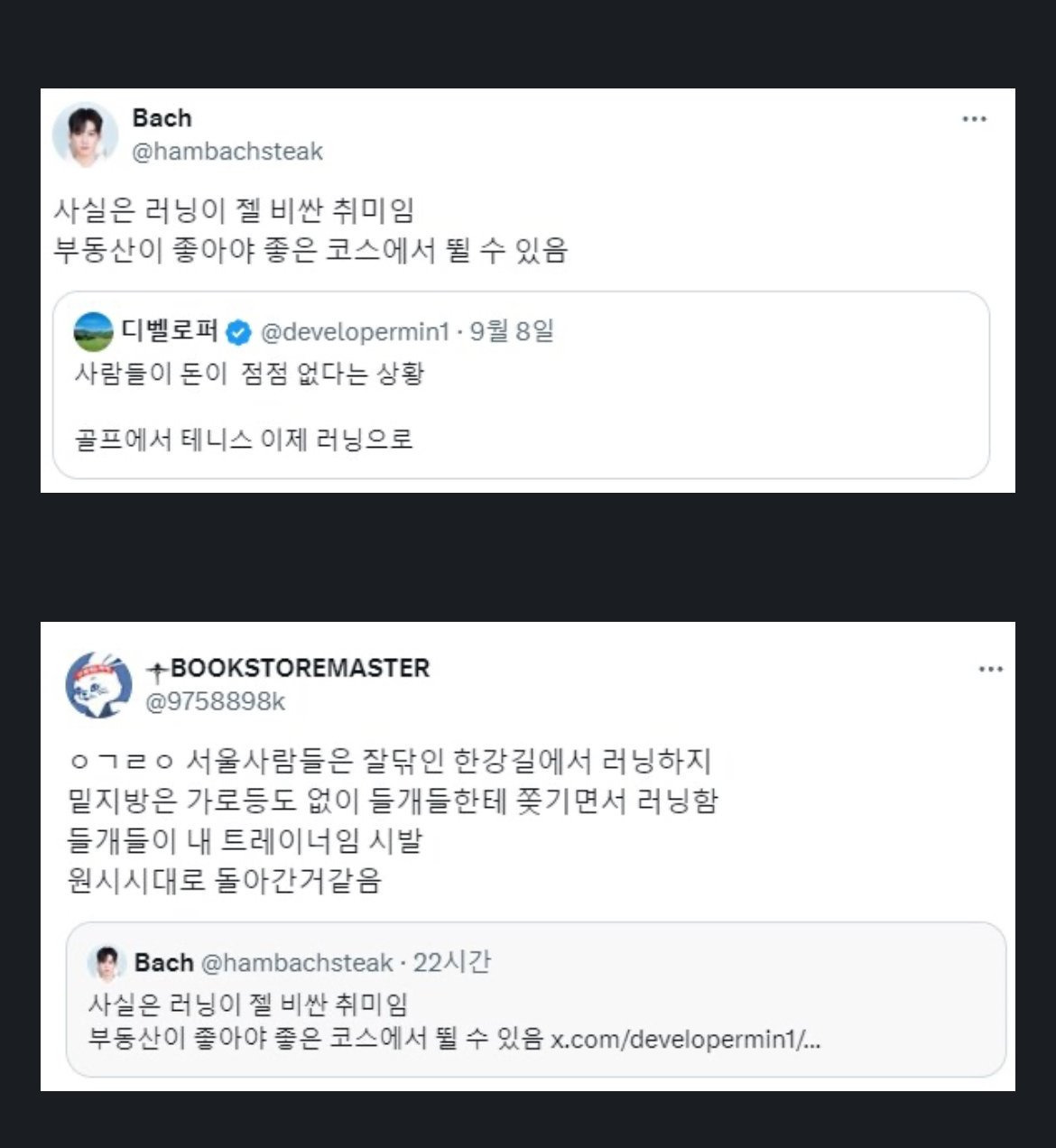 [기타]사실은 러닝이 젤 비싼 취미임.twt 작성자JB|작성시간25.12.30|조회수965 목록 댓글 2 글자크기 작게가 글자크기 크게가 다음검색 현재 게시글 추가 기능 열기 북마크 공유하기 신고 센터로 신고 댓글 댓글 2 댓글쓰기 답글쓰기 댓글 리스트 작성자JB | 작성시간 25.12.30 ㄹㅇ 작성자JB | 작성시간 25.12.31 웃기고있네 무슨 한강변에서만 해야 런닝인가 이렇게 쥐어짜내서 불행배틀하는거 진짜 ㅂㄹ 댓글 전체보기