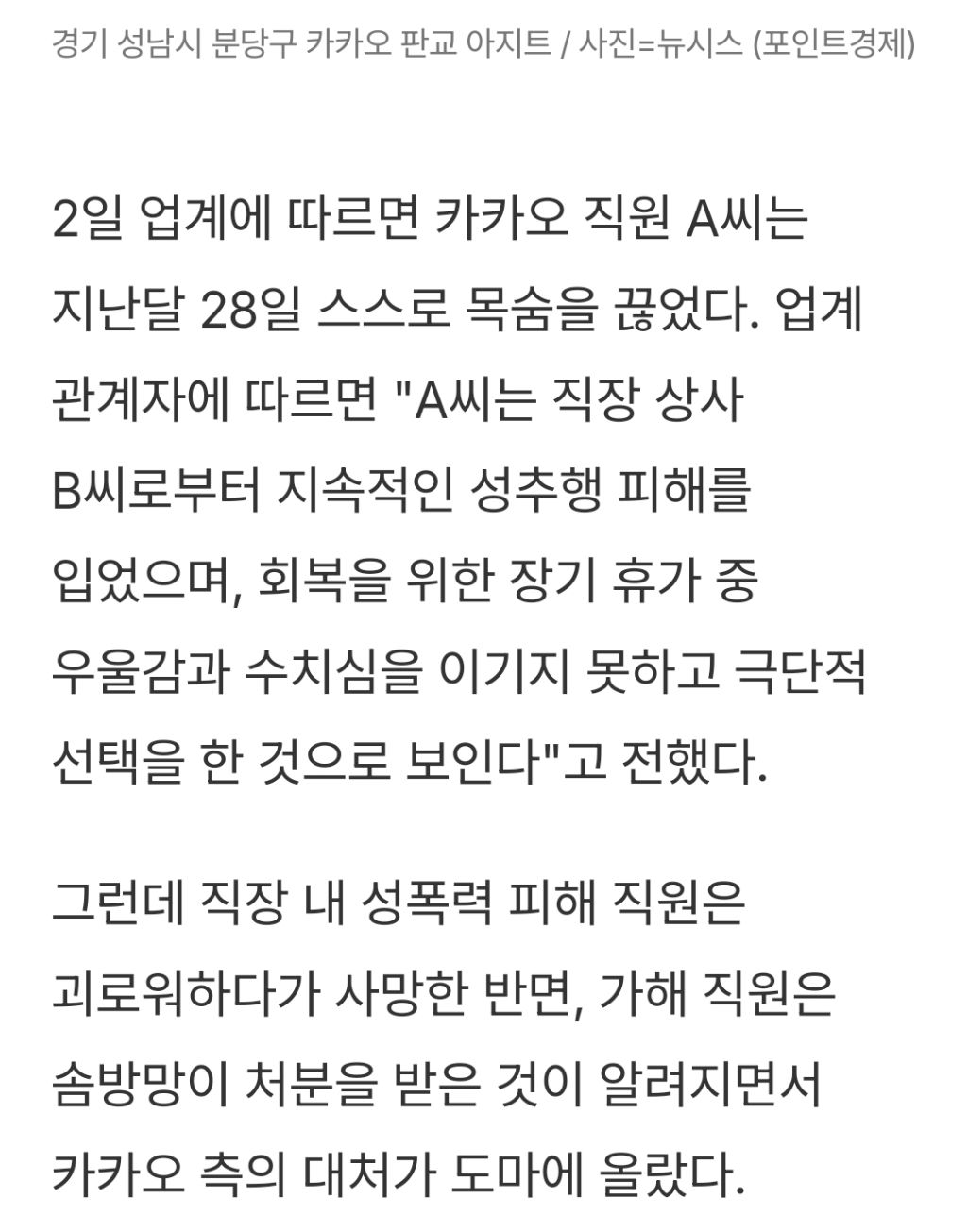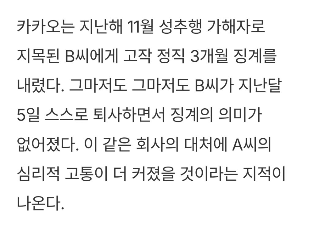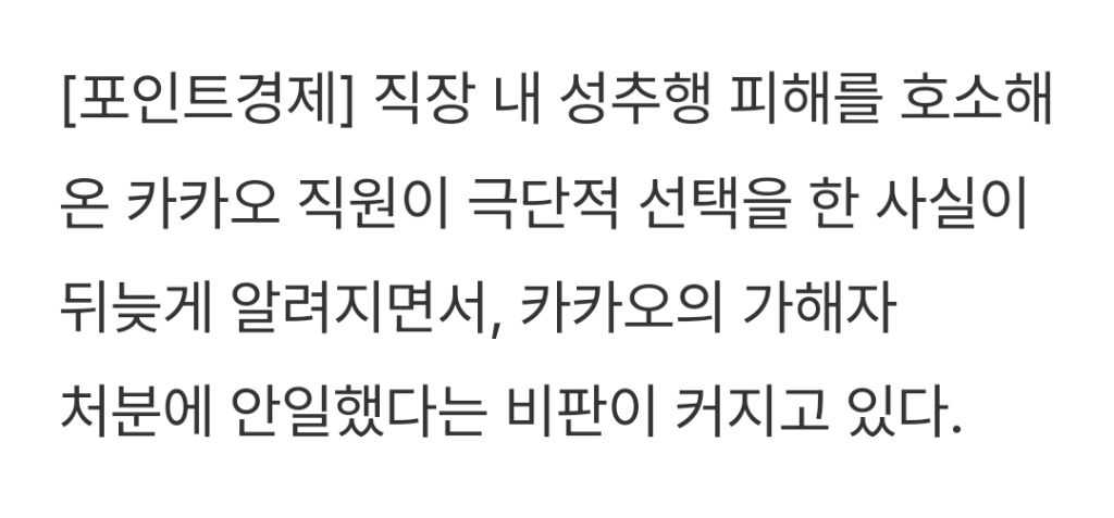 [스크랩] [기사]카카오, 사내 성추행 피해자 극단 선택..."가해자 '정직 3개월', 같은 공간에 방치" 작성자JB|작성시간26.01.04|조회수391 목록 댓글 1 글자크기 작게가 글자크기 크게가 출처: https://www.pointe.co.kr/news/articleView.html?idxno=67108카카오, 사내 성추행 피해자 극단 선택..."가해자 '정직 3개월', 같은 공간에 방치"[포인트경제] 직장 내 성추행 피해를 호소해 온 카카오 직원이 극단적 선택을 한 사실이 뒤늦게 알려지면서, 카카오의 가해자 처분에 안일했다는 비판이 커지고 있다.2일 업계에 따르면 카카오 www.pointe.co.kr전체 내용은 출처에서 확인하기 다음검색 스크랩 원문 : *여성시대* 차분한 20대들의 알흠다운 공간 현재 게시글 추가 기능 열기 북마크 공유하기 신고 센터로 신고 댓글 댓글 1 댓글쓰기 답글쓰기 댓글 리스트 작성자JB | 작성시간 26.01.04 ㅁㅊ 댓글 전체보기