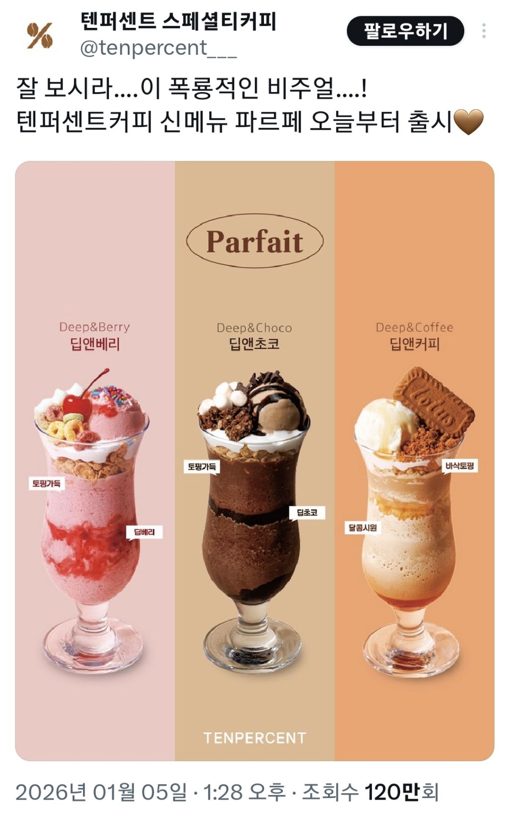 [음식]텐퍼센트커피 신메뉴 파르페 출시 작성자JB|작성시간26.01.06|조회수1,499 목록 댓글 0 글자크기 작게가 글자크기 크게가 https://x.com/i/status/2008032776793301057 다음검색 현재 게시글 추가 기능 열기 북마크 공유하기 신고 센터로 신고 댓글 댓글 0 댓글쓰기 답글쓰기 댓글 리스트