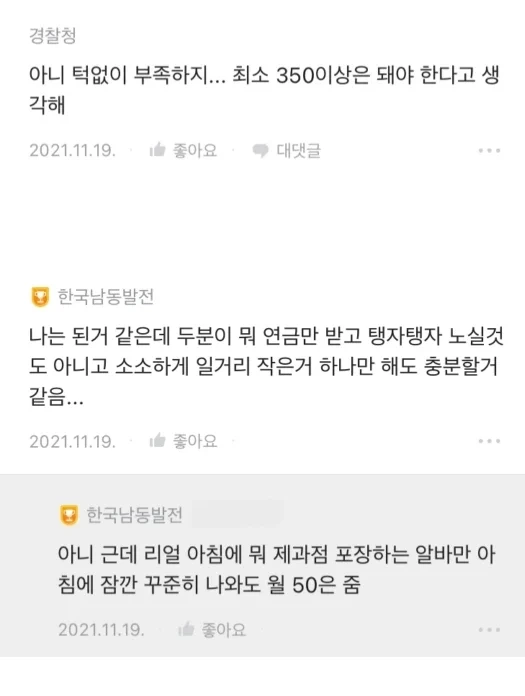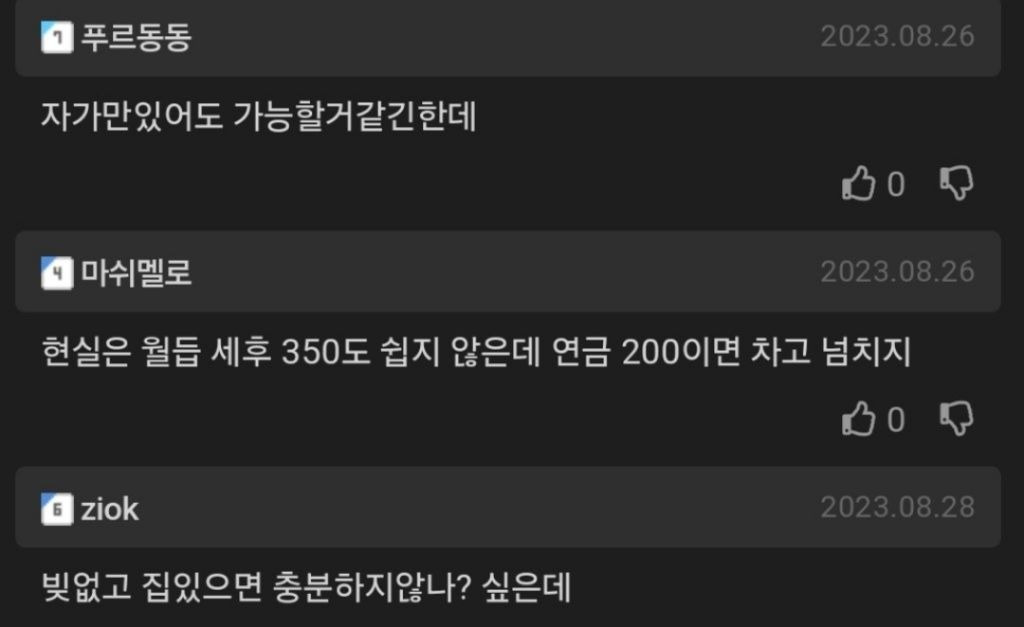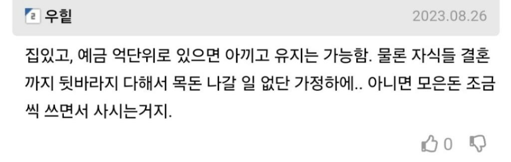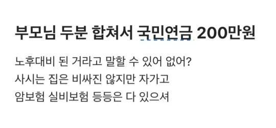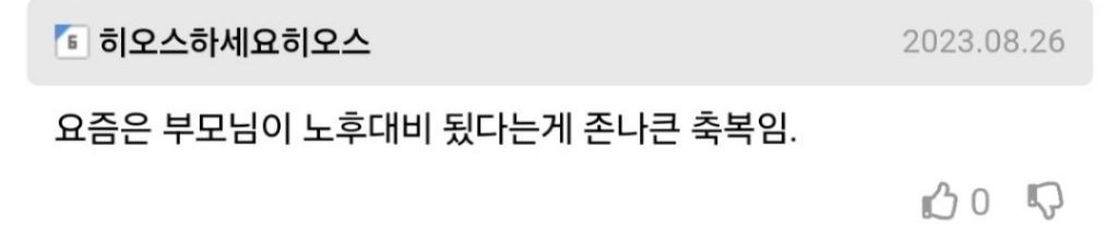 [기타]부모님 두분 합쳐서 국민연금 200이면 노후준비 충분한거야? 작성자JB|작성시간26.01.06|조회수762 목록 댓글 1 글자크기 작게가 글자크기 크게가 다음검색 현재 게시글 추가 기능 열기 북마크 공유하기 신고 센터로 신고 댓글 댓글 1 댓글쓰기 답글쓰기 댓글 리스트 작성자JB | 작성시간 26.01.06 막댓 ㄹㅇ 댓글 전체보기