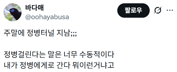 [기타]주말에 정병터널 지남 작성자JB|작성시간26.01.06|조회수437 목록 댓글 1 글자크기 작게가 글자크기 크게가 https://x.com/oohayabusa/status/2008093518439596342?s=20 다음검색 현재 게시글 추가 기능 열기 북마크 공유하기 신고 센터로 신고 댓글 댓글 1 댓글쓰기 답글쓰기 댓글 리스트 작성자JB | 작성시간 26.01.06 ㅋㅋㅋ 댓글 전체보기