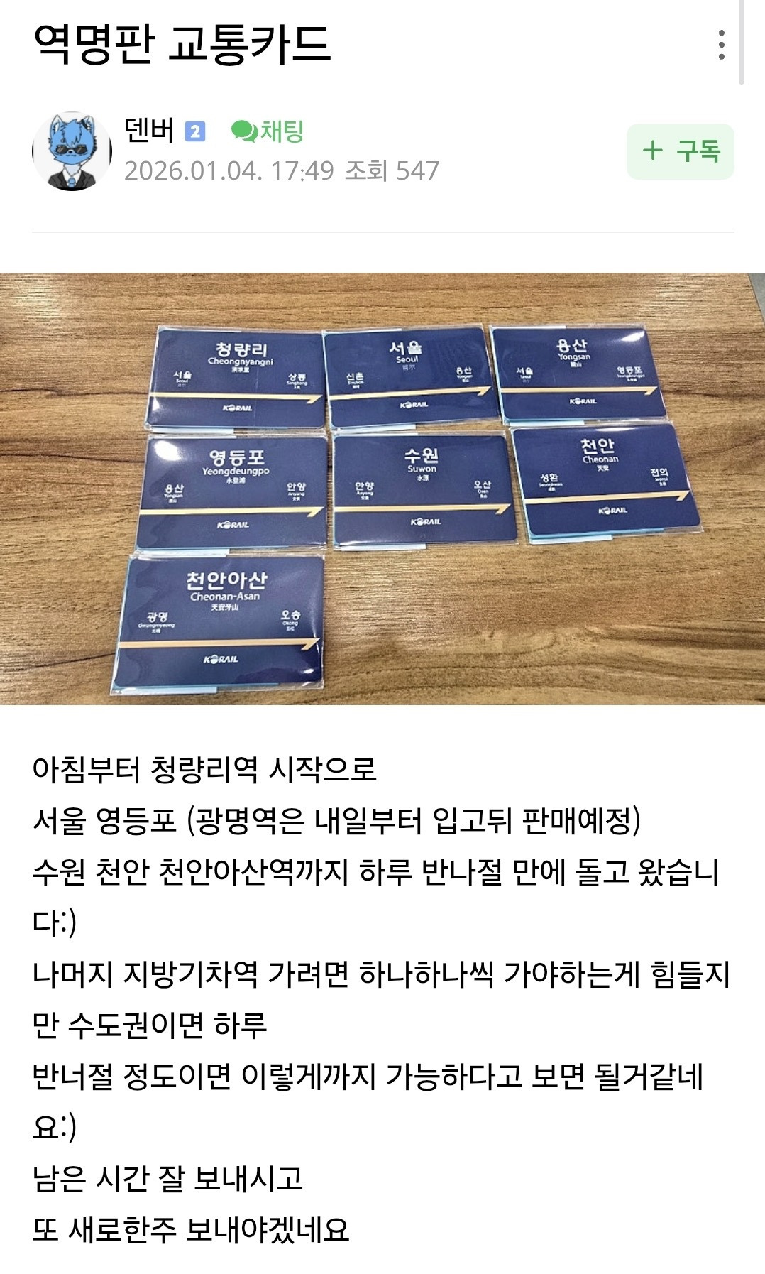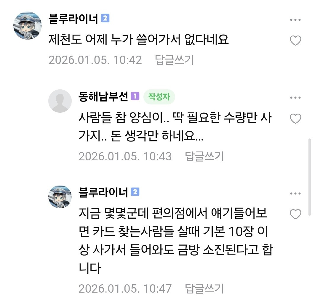 [기타]실시간 철도카페 난리난 코레일 굿즈ㄷㄷ 작성자JB|작성시간26.01.06|조회수2,621 목록 댓글 2 글자크기 작게가 글자크기 크게가 다음검색 현재 게시글 추가 기능 열기 북마크 공유하기 신고 센터로 신고 댓글 댓글 2 댓글쓰기 답글쓰기 댓글 리스트 작성자JB | 작성시간 26.01.06 오 작성자JB | 작성시간 26.01.06 ㅂㄹ디 댓글 전체보기