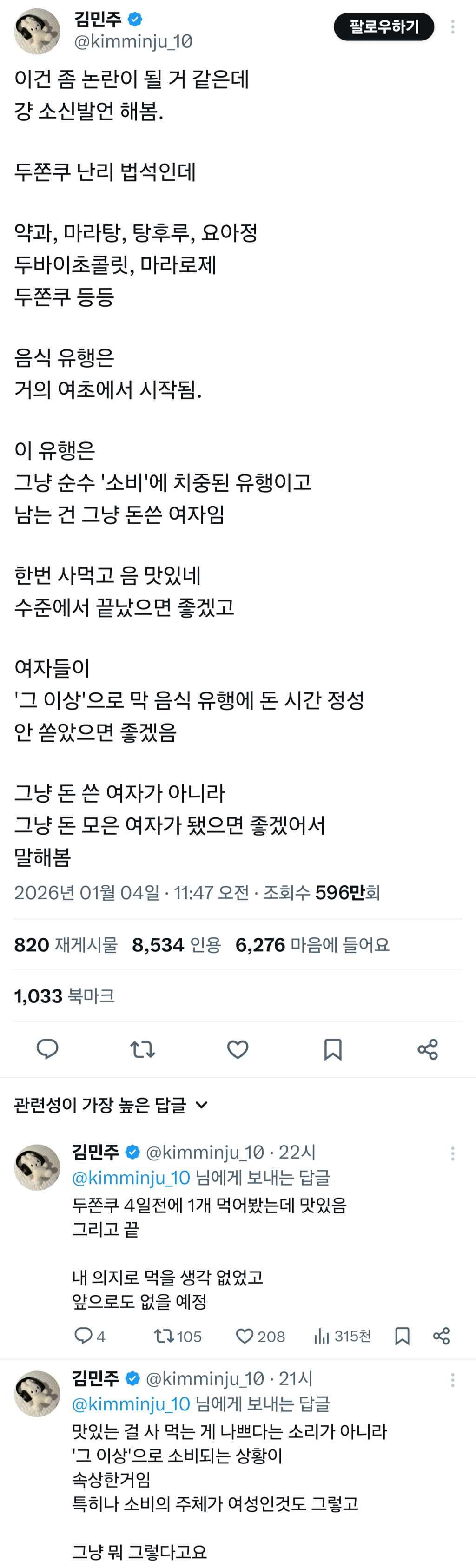작성자JB 작성시간 26.01.11 뚱카롱이든 크로플이든 유행해서 먹은 게 인생에 얼마나 도움됐음? 나도 디저트 ㅈㄴ좋아하지만 저 글에 공감해