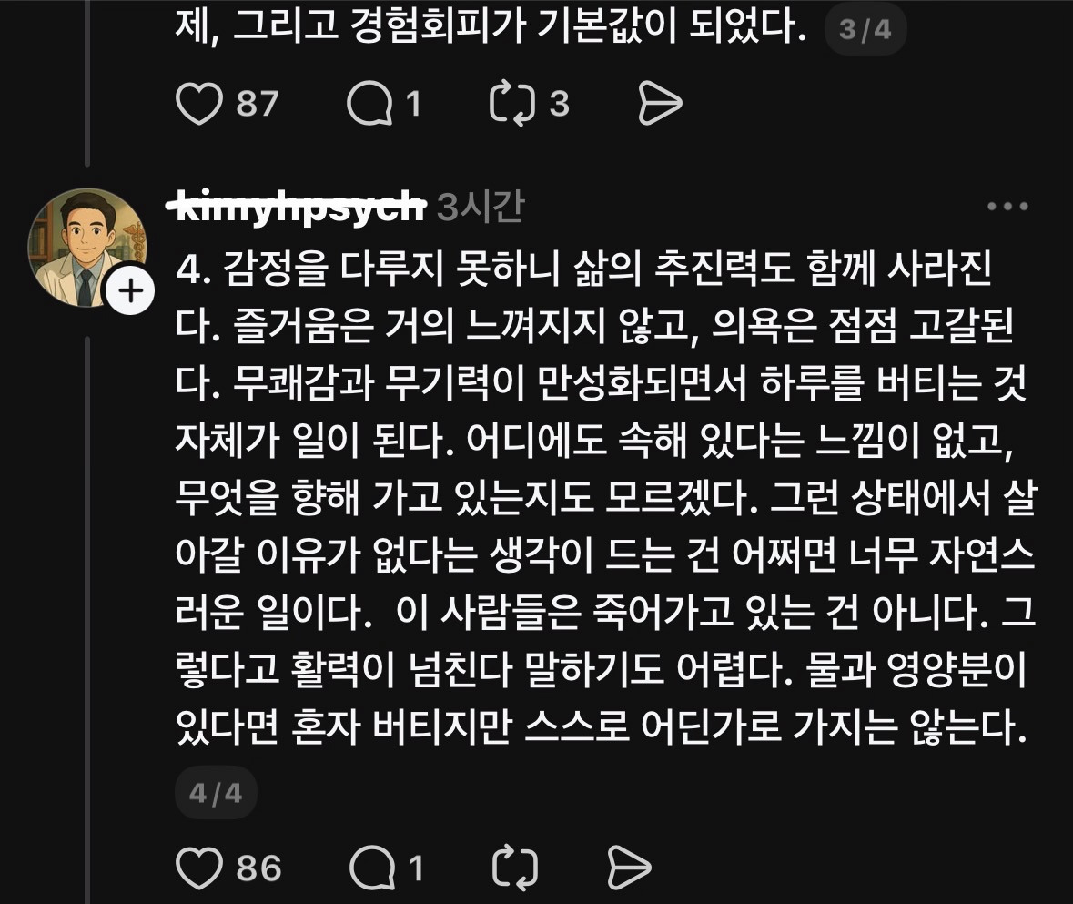[기타]요즘 젊은층에서 나타난다는 우울증 형태 작성자JB|작성시간26.02.03|조회수4,376 목록 댓글 4 글자크기 작게가 글자크기 크게가 다음검색 현재 게시글 추가 기능 열기 북마크 공유하기 신고 센터로 신고 댓글 댓글 4 댓글쓰기 답글쓰기 댓글 리스트 작성자JB | 작성시간 26.02.03 ㅠㅠ 작성자JB | 작성시간 26.02.03 나 이래서 정신과 갔다왔는데 별일 아니라고 해서 더 허무하고 무력해짐… 그냥 다들 이러고 사는데 나만 이거에 너무 힘들어하는 것 같아서 작성자JB | 작성시간 26.02.03 나다 작성자JB | 작성시간 26.02.03 전까지는 ㅈㅅ 생각하다가 작년부터 딱 본문 상태임 댓글 전체보기