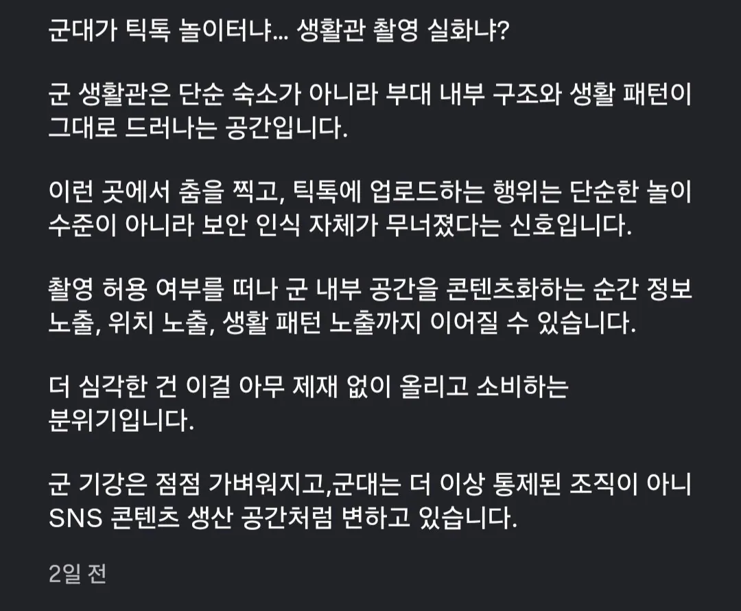 지금 인스타에서 욕 엄청 먹는 군인 영상 작성자JB|작성시간26.03.21|조회수913 목록 댓글 2 글자크기 작게가 글자크기 크게가 다음검색 현재 게시글 추가 기능 열기 북마크 공유하기 신고 센터로 신고 댓글 댓글 2 댓글쓰기 답글쓰기 댓글 리스트 작성자JB | 작성시간 26.03.21 누구임..? 설마 내가 아는 인플은 아니겠지 ㅅㅂ 작성자JB | 작성시간 26.03.21 군캉스ㅋㅋ 댓글 전체보기