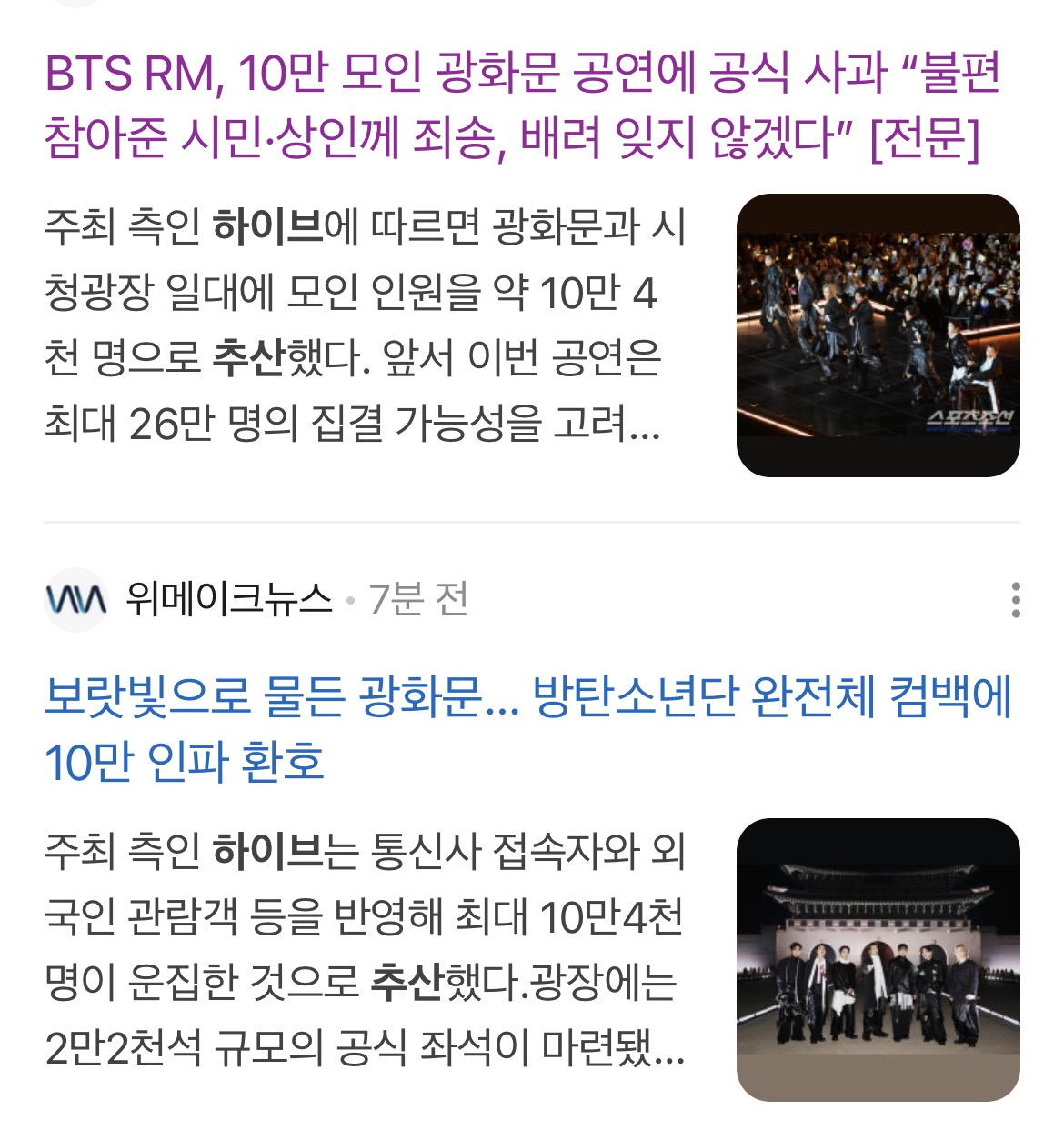 BTS 소속사 하이브는 10만 4,000명이 집결한 것으로 봤다. 서울시 추산 인원에는 알뜰폰 사용자와 외국인이 일부 반영되지 않았다는 게 하이브 측의 설명이다. 광화문 광장에 마련된 공식 좌석은 총 2만 2,000석 규모였다.