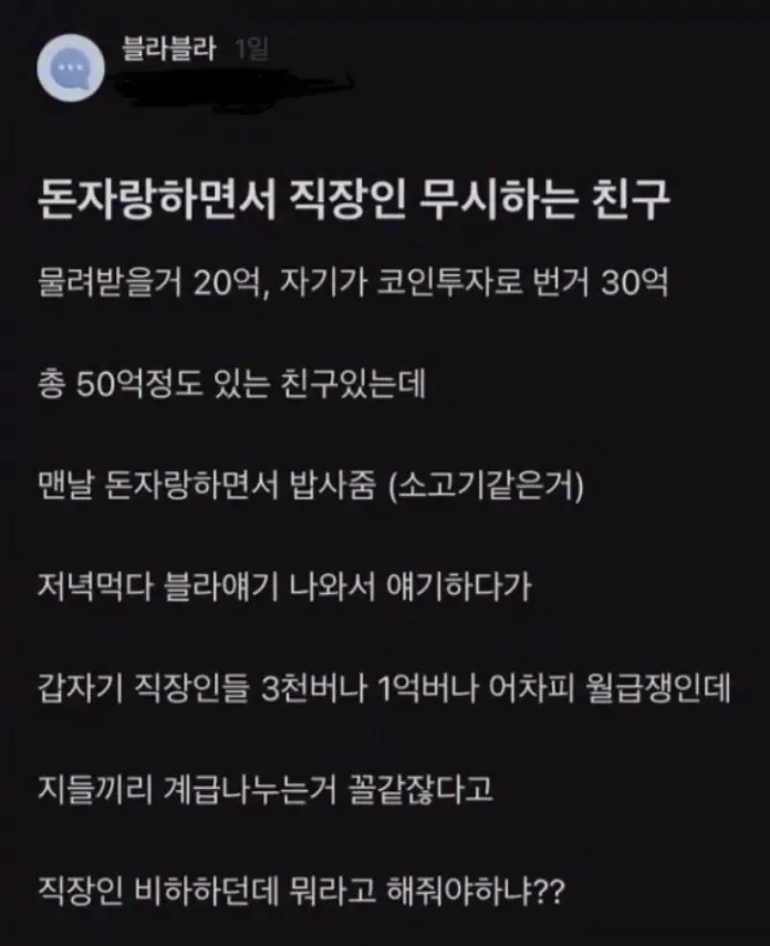 [기타]돈자랑 하면서 직장인 무시하는 친구 작성자JB|작성시간26.03.24|조회수445 목록 댓글 4 글자크기 작게가 글자크기 크게가 다음검색 현재 게시글 추가 기능 열기 북마크 공유하기 신고 센터로 신고 댓글 댓글 4 댓글쓰기 답글쓰기 댓글 리스트 작성자JB | 작성시간 26.03.24 그러게 ㅠㅠ 우리 다음엔 파인다이닝 가자 작성자JB | 작성시간 26.03.24 친구말이 다 맞지 작성자JB | 작성시간 26.03.24 고마운 친구다.. 작성자JB | 작성시간 26.03.24 드엏구나 모수가자 댓글 전체보기