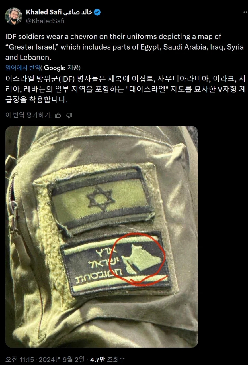 이스라엘 군인들이 군복에 부착하는 패치의 의미 작성자JB|작성시간26.03.24|조회수289 목록 댓글 0 글자크기 작게가 글자크기 크게가 이스라엘의 꿈유대교 경전에 나오는 '약속의 땅' 재건이라크, 레바논, 시리아, 요르단, 이집트, 사우디, 쿠웨이트 땅까지 포함됨 다음검색 현재 게시글 추가 기능 열기 북마크 공유하기 신고 센터로 신고 댓글 댓글 0 댓글쓰기 답글쓰기 댓글 리스트