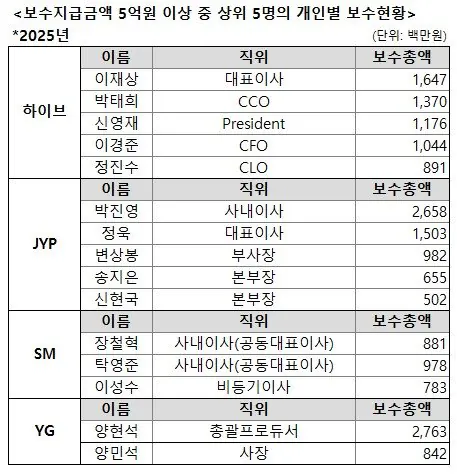 25년 4대 기획사 직원 현황(급여/5억이상수령자) 작성자JB|작성시간26.03.24|조회수331 목록 댓글 2 글자크기 작게가 글자크기 크게가 다음검색 현재 게시글 추가 기능 열기 북마크 공유하기 신고 센터로 신고 댓글 댓글 2 댓글쓰기 답글쓰기 댓글 리스트 작성자JB | 작성시간 26.03.24 방은 왜 저기없어? 답댓글 작성자JB 작성자 본인 여부 작성자 | 작성시간 26.03.24 내가 만든게 아니라서... 댓글 전체보기