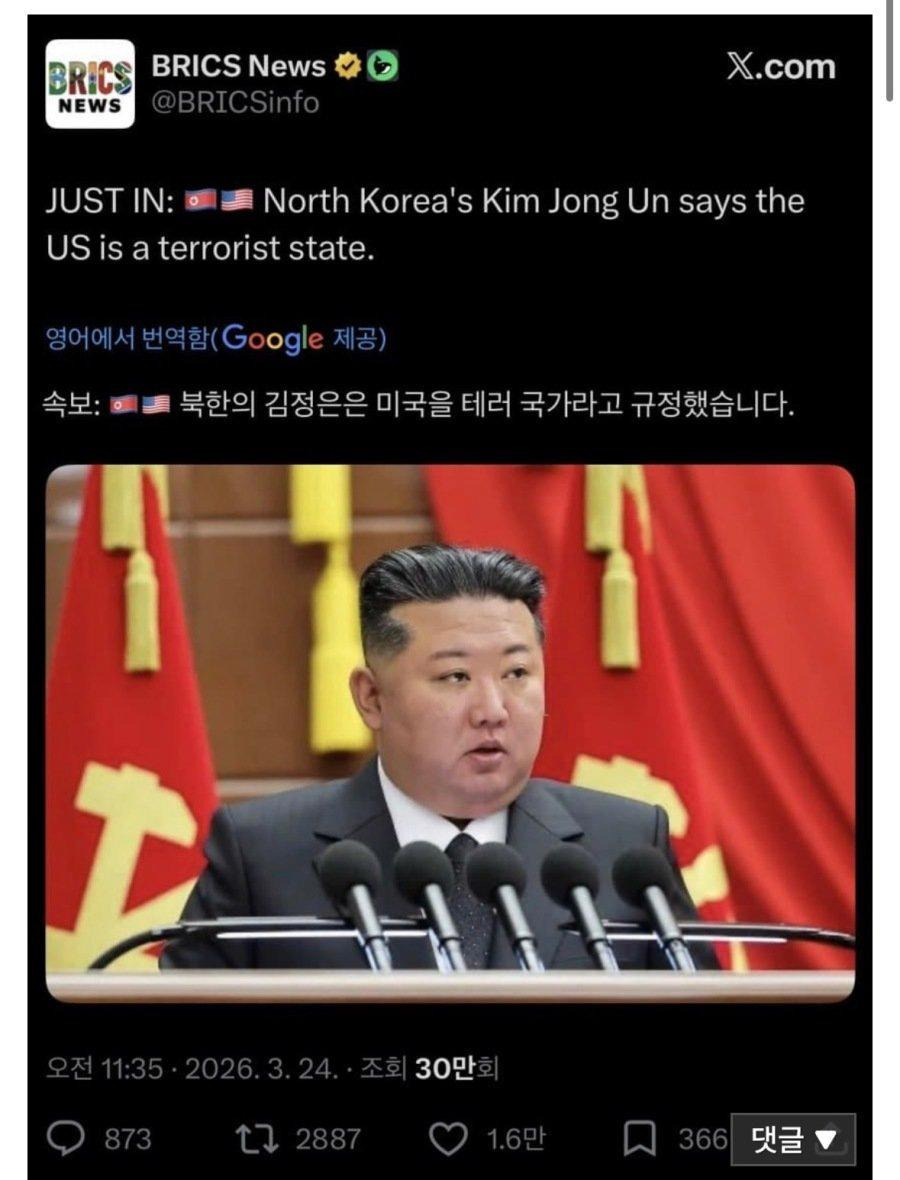 [기타][속보] 김정은, 미국을 테러 국가로 지정 작성자JB|작성시간26.03.24|조회수485 목록 댓글 1 글자크기 작게가 글자크기 크게가 다음검색 현재 게시글 추가 기능 열기 북마크 공유하기 신고 센터로 신고 댓글 댓글 1 댓글쓰기 답글쓰기 댓글 리스트 작성자JB | 작성시간 26.03.24 요즘 돌아가는거 보면 댓글 전체보기