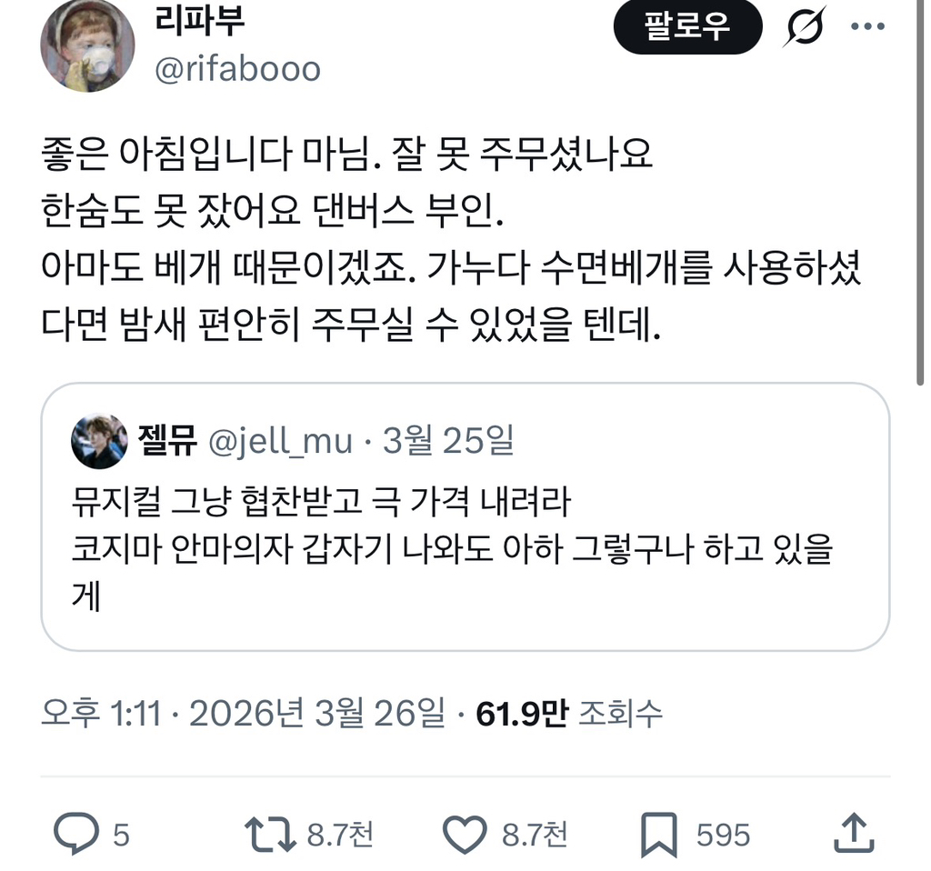 [스크랩] [유머]그냥 협찬 받고 뮤지컬 가격 내려라 작성자JB|작성시간26.03.27|조회수462 목록 댓글 2 글자크기 작게가 글자크기 크게가 출처: https://x.com/rifabooo/status/2037019536474726594 다음검색 스크랩 원문 : *여성시대* 차분한 20대들의 알흠다운 공간 현재 게시글 추가 기능 열기 북마크 공유하기 신고 센터로 신고 댓글 댓글 2 댓글쓰기 답글쓰기 댓글 리스트 작성자JB | 작성시간 26.03.27 ㅅㅂㅋㅋㅋㅋ 작성자JB | 작성시간 26.03.27 ㅋㅋㅋㅋㅋㅋㅋㅋㅋㅋㅋㅋ 댓글 전체보기