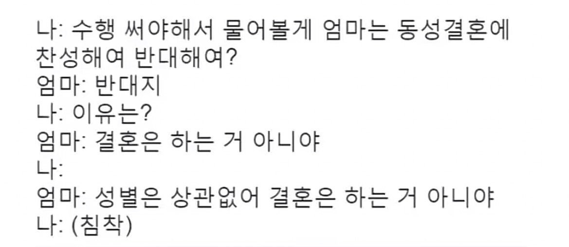 [기타]??: 엄마는 동성결혼에 찬성해여 반대해여? 작성자JB|작성시간26.03.27|조회수260 목록 댓글 1 글자크기 작게가 글자크기 크게가 다음검색 현재 게시글 추가 기능 열기 북마크 공유하기 신고 센터로 신고 댓글 댓글 1 댓글쓰기 답글쓰기 댓글 리스트 작성자JB | 작성시간 26.03.27 ㅋㅋㅋ 댓글 전체보기